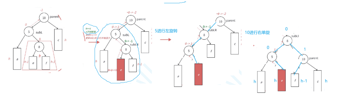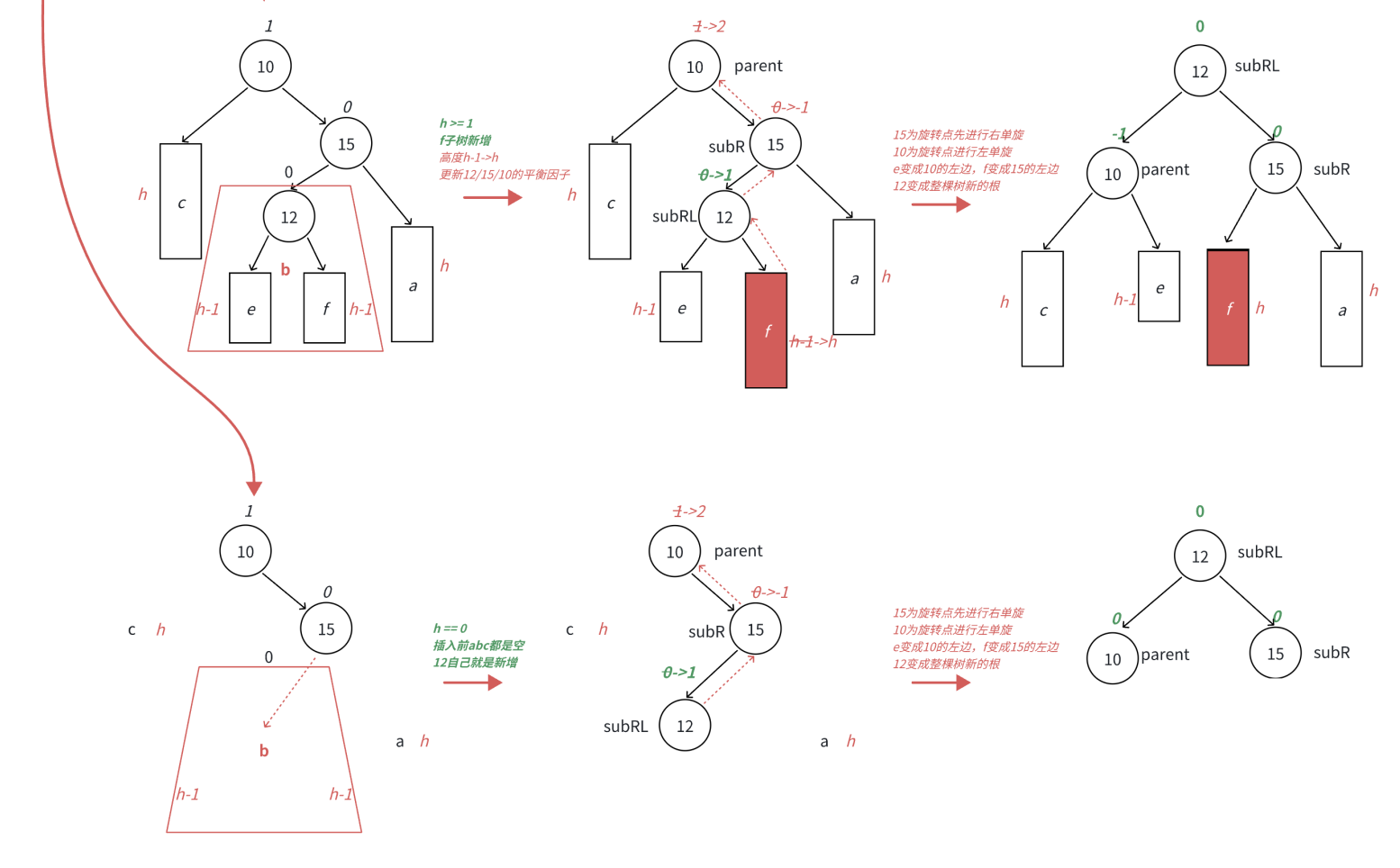 {Node* subR = parent->_right;Node* subRL = subR->_left;int bf = subRL->_bf;RotateR(parent->_right);RotateL(parent);if (bf == 0){subR->_bf = 0;subRL->_bf = 0;parent->_bf = 0;}else if (bf == 1){subR->_bf = 0;subRL->_bf = 0;parent->_bf = -1;}else if (bf == -1){subR->_bf = 1;subRL->_bf = 0;parent->_bf = 0;}else{assert(false);}