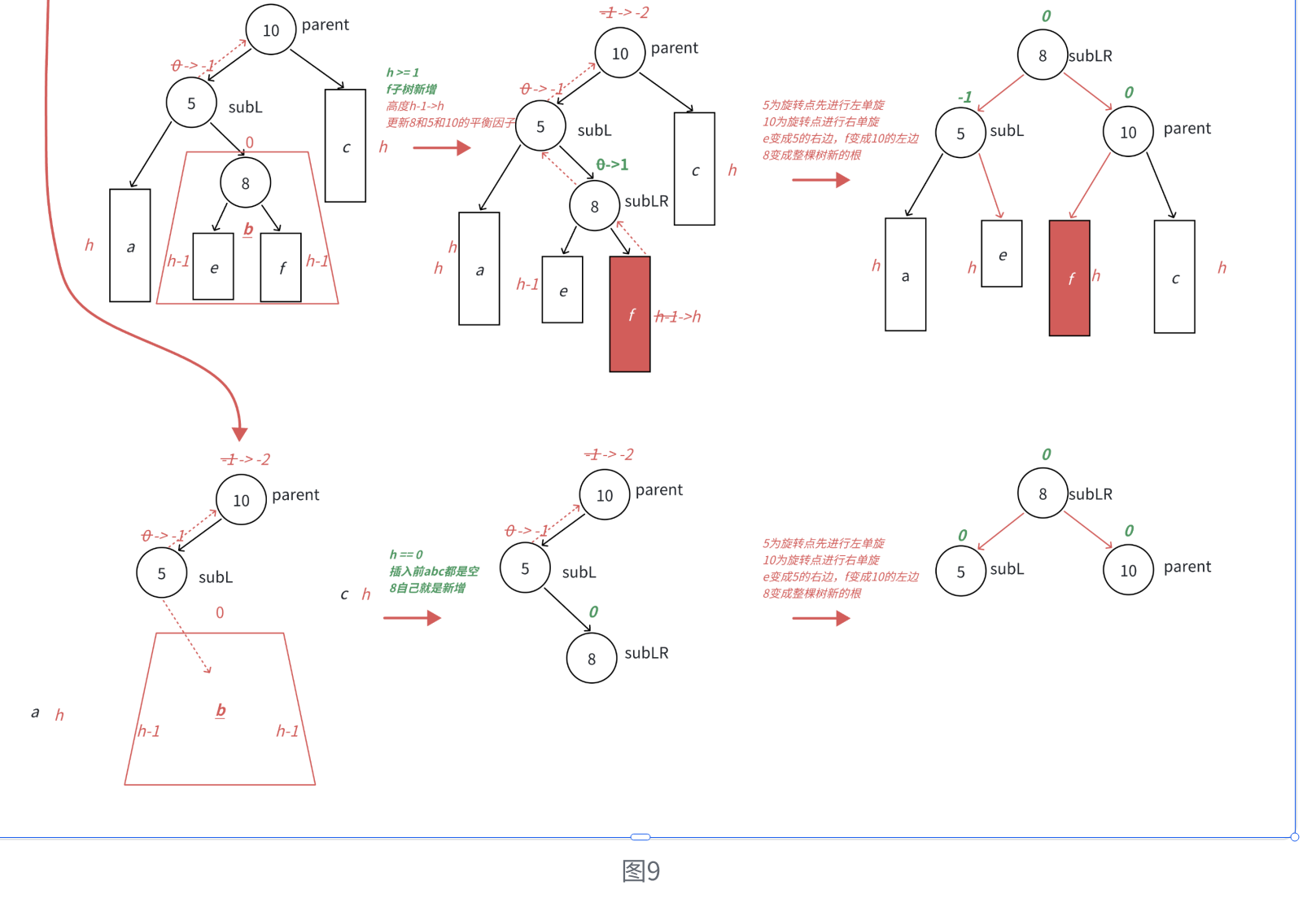 我们通过图9来判断平衡因子的情况:(1)如果是对e插入,那么subLR的平衡因子就会变成-1(2)如果是对f插入,那么subLR的平衡因子就会变成1,(3)subLR的平衡因子是0