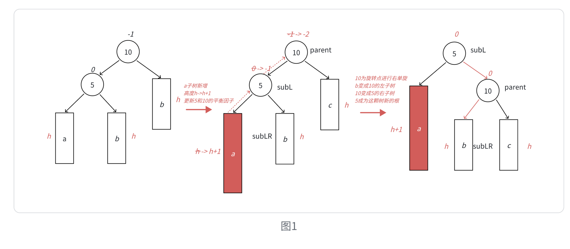 void RotateLR(Node* parent) {// 1. 定义关键节点指针,明确节点关系Node* subL = parent->_left; // subL:parent的左子树Node* subLR = subL->_right; // subLR:subL的右子树int bf = subLR->_bf; // 2. 第一步:对parent的左子树(subL)进行左单旋RotateL(parent->_left); // 3. 第二步:对原不平衡根节点(parent)进行右单旋RotateR(parent); // 4. 根据subLR旋转前的平衡因子,调整三个核心节点(subL、subLR、parent)的平衡因子// 核心原则:旋转后子树高度恢复到插入前状态,平衡因子需同步重置为合理值if (bf == 0) {// 场景3:h==0时,subLR是新增节点(e、f子树为空)subL->_bf = 0; subLR->_bf = 0; parent->_bf = 0; } else if (bf == -1) {// 场景1:h>=1时,新增节点插入在subLR的左子树(e子树)subL->_bf = 0; subLR->_bf = 0; parent->_bf = 1; } else if (bf == 1) {// 场景2:h>=1时,新增节点插入在subLR的右子树(f子树)subL->_bf = -1; subLR->_bf = 0; parent->_bf = 0; } else{// 异常情况:平衡因子只能是-1、0、1,否则说明之前的平衡因子维护有误assert(false);}