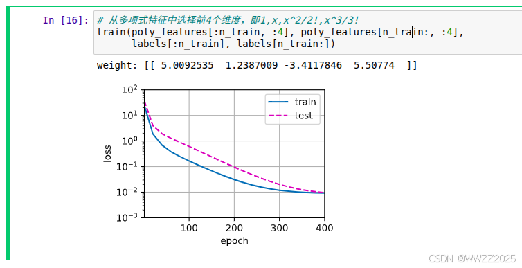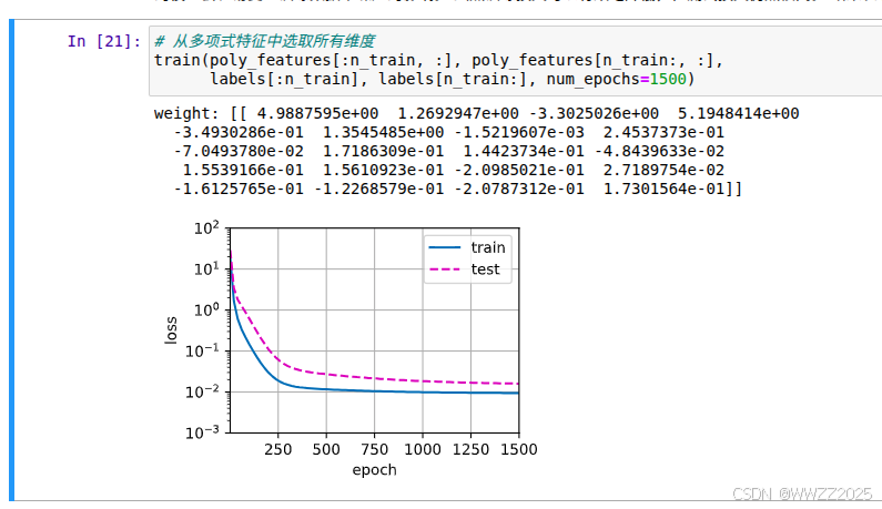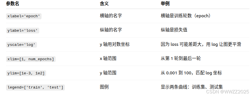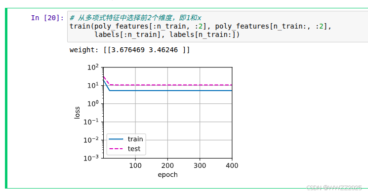 def train(train_features, test_features, train_labels, test_labels,num_epochs=400):loss = nn.MSELoss(reduction='none')input_shape = train_features.shape[-1]# 不设置偏置,因为我们已经在多项式中实现了它net = nn.Sequential(nn.Linear(input_shape, 1, bias=False))batch_size = min(10, train_labels.shape[0]) #取10和训练标签的小值做为批量大小train_iter = d2l.load_array((train_features, train_labels.reshape(-1,1)),batch_size)test_iter = d2l.load_array((test_features, test_labels.reshape(-1,1)),batch_size, is_train=False)trainer = torch.optim.SGD(net.parameters(), lr=0.01)animator = d2l.Animator(xlabel='epoch', ylabel='loss', yscale='log',xlim=[1, num_epochs], ylim=[1e-3, 1e2],legend=['train', 'test'])for epoch in range(num_epochs):d2l.train_epoch_ch3(net, train_iter, loss, trainer)if epoch == 0 or (epoch + 1) % 20 == 0:animator.add(epoch + 1, (evaluate_loss(net, train_iter, loss),evaluate_loss(net, test_iter, loss)))print('weight:', net[0].weight.data.numpy())(1)MSELoss:使用MSE损失函数,详见5.4.2https://blog.csdn.net/weixin_45728280/article/details/153778299?spm=1011.2415.3001.5331