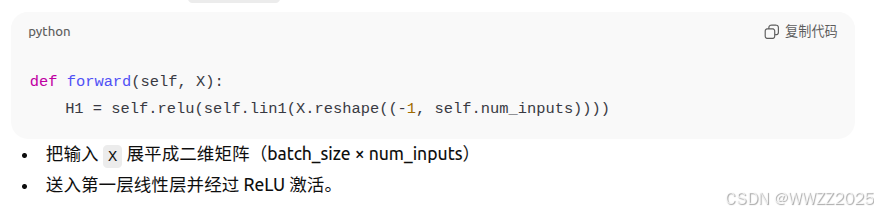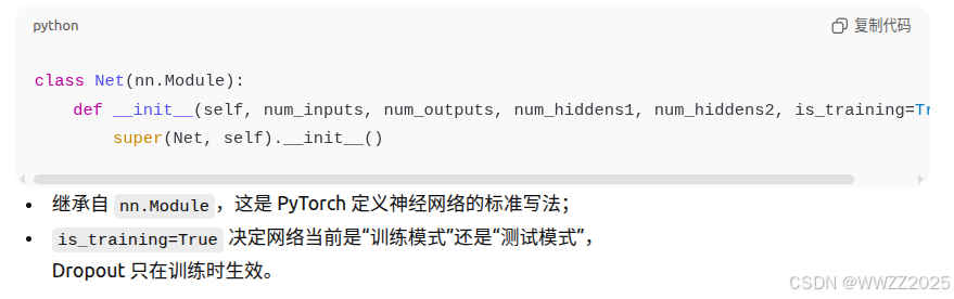 #定义模型参数 num_inputs, num_outputs, num_hiddens1, num_hiddens2 = 784, 10, 256, 256dropout1, dropout2 = 0.2, 0.5class Net(nn.Module):def __init__(self, num_inputs, num_outputs, num_hiddens1, num_hiddens2,is_training = True):super(Net, self).__init__()self.num_inputs = num_inputsself.training = is_training#定义各层self.lin1 = nn.Linear(num_inputs, num_hiddens1)self.lin2 = nn.Linear(num_hiddens1, num_hiddens2)self.lin3 = nn.Linear(num_hiddens2, num_outputs)self.relu = nn.ReLU()#前向传播def forward(self, X):H1 = self.relu(self.lin1(X.reshape((-1, self.num_inputs))))# 只有在训练模型时才使用dropoutif self.training == True:# 在第一个全连接层之后添加一个dropout层H1 = dropout_layer(H1, dropout1)H2 = self.relu(self.lin2(H1))if self.training == True:# 在第二个全连接层之后添加一个dropout层H2 = dropout_layer(H2, dropout2)out = self.lin3(H2)return outnet = Net(num_inputs, num_outputs, num_hiddens1, num_hiddens2)(1)class Net(nn.Module)