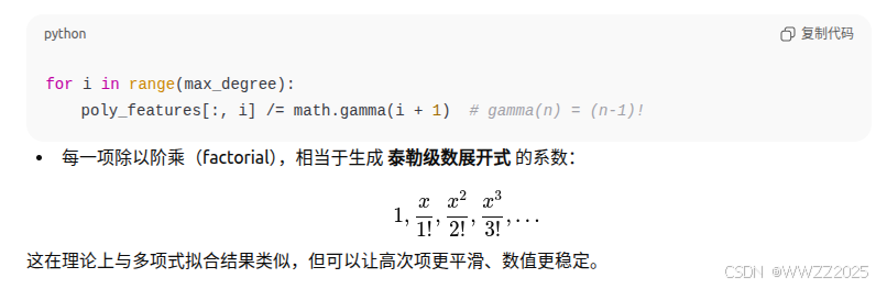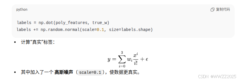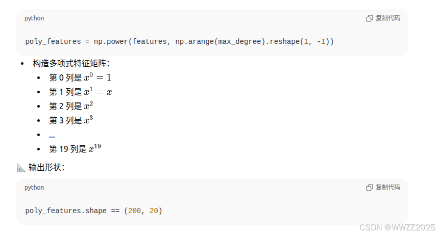 max_degree = 20 # 多项式的最大阶数 n_train, n_test = 100, 100 # 训练和测试数据集大小 true_w = np.zeros(max_degree) # 分配大量的空间 true_w[0:4] = np.array([5, 1.2, -3.4, 5.6])features = np.random.normal(size=(n_train + n_test, 1)) np.random.shuffle(features)#生成200个随机输入x服从标准正态分布,打乱顺序防止训练集和测试集有序 poly_features = np.power(features, np.arange(max_degree).reshape(1, -1)) for i in range(max_degree):poly_features[:, i] /= math.gamma(i + 1) # gamma(n)=(n-1)! # labels的维度:(n_train+n_test,) labels = np.dot(poly_features, true_w) labels += np.random.normal(scale=0.1, size=labels.shape)