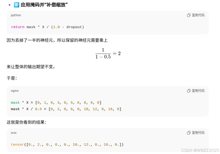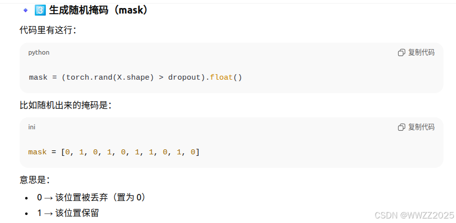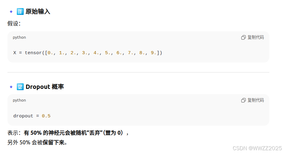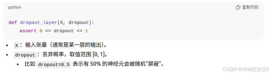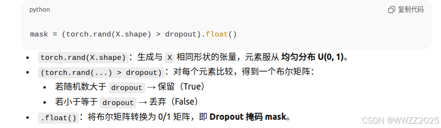 import torch from torch import nn from d2l import torch as d2l#定义函数 def dropout_layer(X, dropout):assert 0 <= dropout <= 1# 在本情况中,所有元素都被丢弃if dropout == 1:return torch.zeros_like(X)# 在本情况中,所有元素都被保留if dropout == 0:return X#生成随机掩码mask = (torch.rand(X.shape) > dropout).float()return mask * X / (1.0 - dropout)(1)定义函数