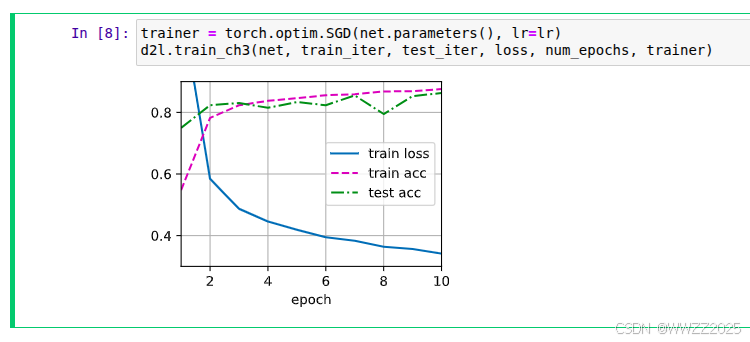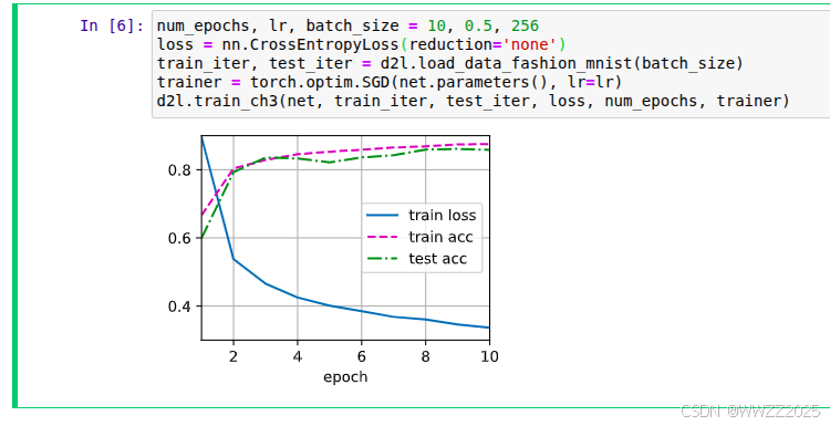 #训练与测试 num_epochs, lr, batch_size = 10, 0.5, 256 loss = nn.CrossEntropyLoss(reduction='none') train_iter, test_iter = d2l.load_data_fashion_mnist(batch_size) trainer = torch.optim.SGD(net.parameters(), lr=lr) #调用训练函数 d2l.train_ch3(net, train_iter, test_iter, loss, num_epochs, trainer)