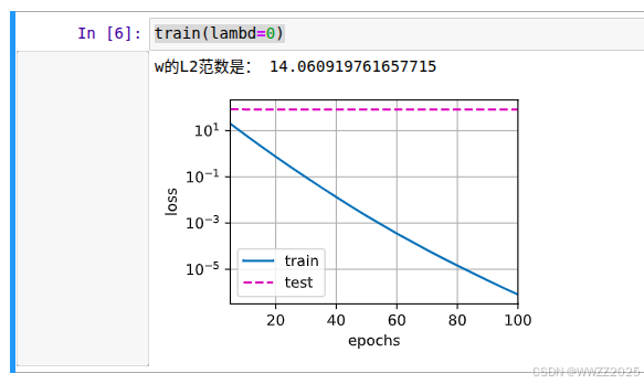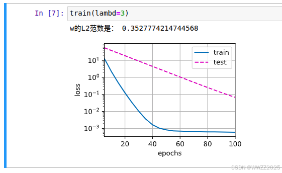 #定义训练代码实现 def train(lambd):w, b = init_params()net, loss = lambda X: d2l.linreg(X, w, b), d2l.squared_lossnum_epochs, lr = 100, 0.003animator = d2l.Animator(xlabel='epochs', ylabel='loss', yscale='log',xlim=[5, num_epochs], legend=['train', 'test'])for epoch in range(num_epochs):for X, y in train_iter:# 增加了L2范数惩罚项,# 广播机制使l2_penalty(w)成为一个长度为batch_size的向量l = loss(net(X), y) + lambd * l2_penalty(w)l.sum().backward()d2l.sgd([w, b], lr, batch_size)if (epoch + 1) % 5 == 0:animator.add(epoch + 1, (d2l.evaluate_loss(net, train_iter, loss),d2l.evaluate_loss(net, test_iter, loss)))print('w的L2范数是:', torch.norm(w).item())(1)d2l.squared_loss