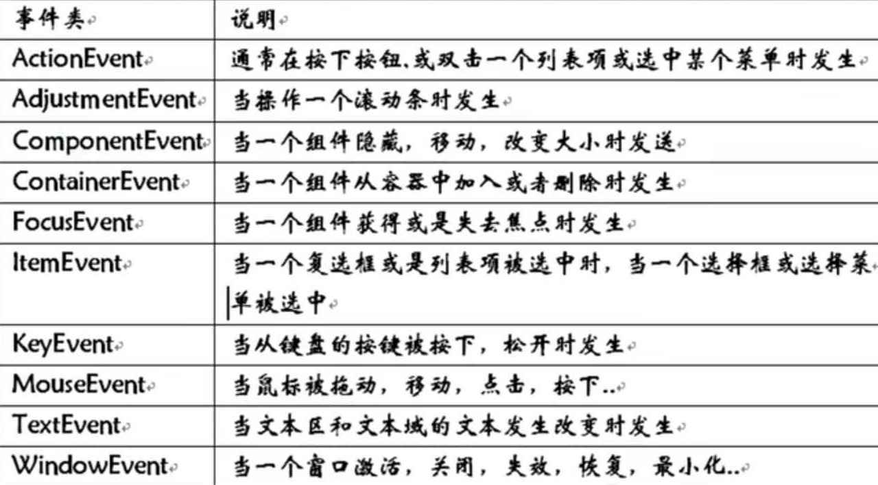 2.事件:事件就是承载事件源状态改变时的对象,比如当键盘事件,鼠标事件,窗口事件等等,会生成一个事件对象,该对象保存着当前事件很多信息,比如KeyEvent对象有含义被按下键的Code值.Java,awt.event包和javax.swing.event包中定义了各种事件类型