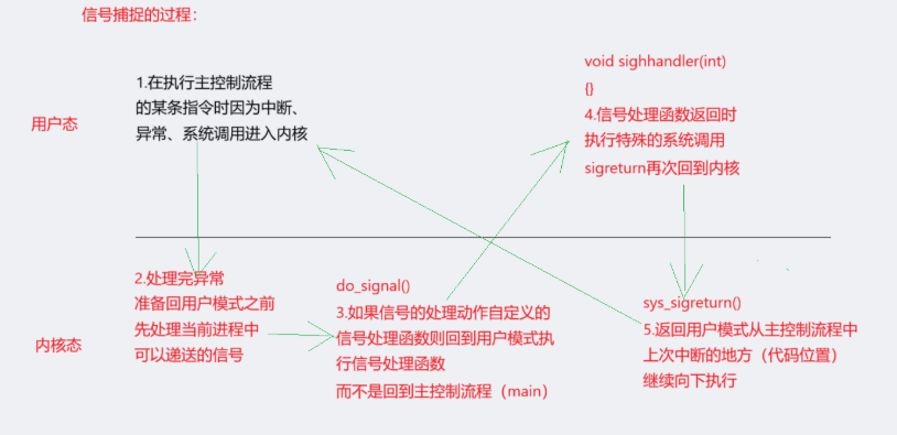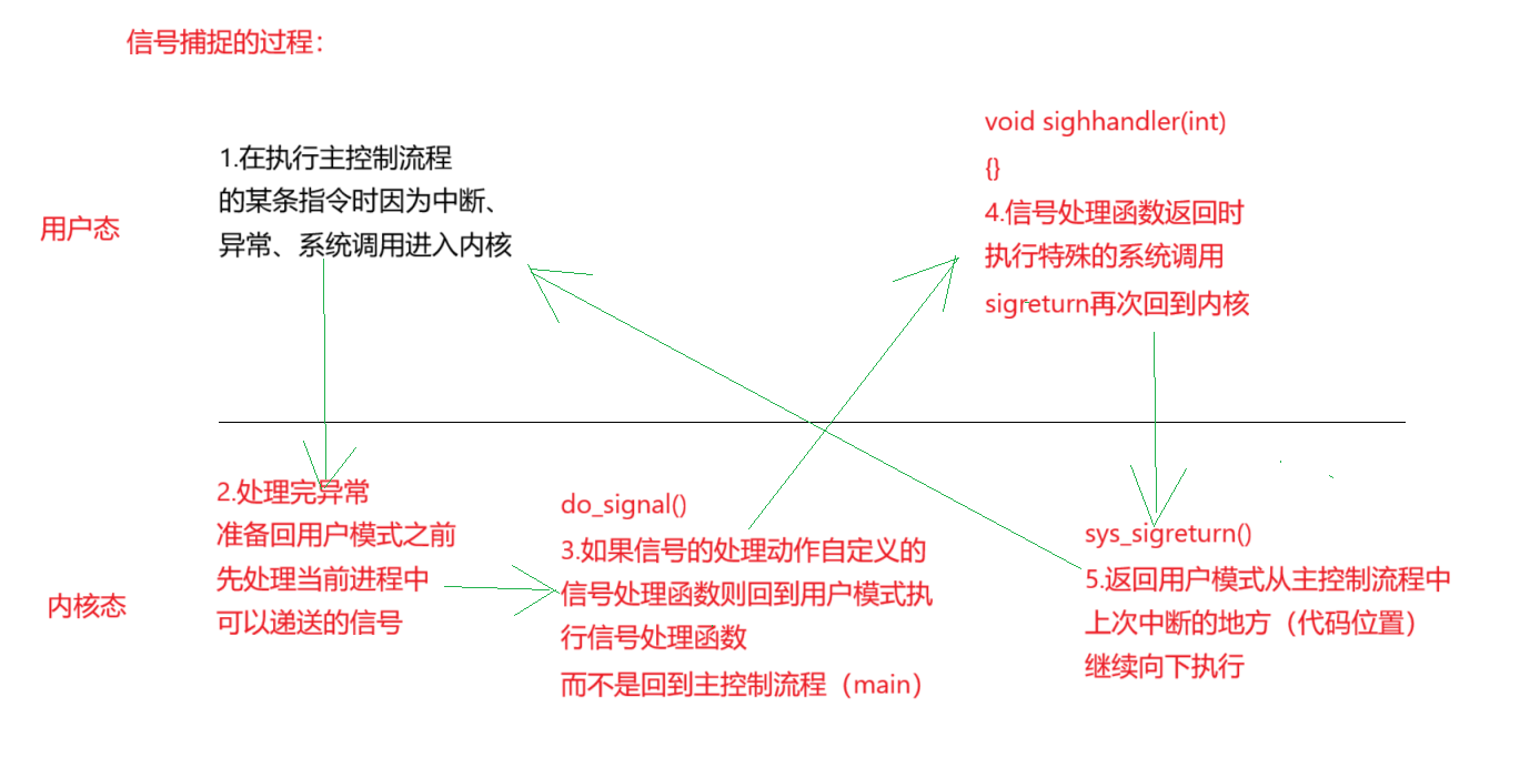 如果信号的处理动作是用户自定义函数,在信号递达时就调用这个函数,这称为捕捉信号。由于信号处理函数的代码是在用户空间的,处理过程比较复杂,举例如下: 用户程序注册了SIGQUIT信号的处理函数sighandler。 当前正在执行main函数,这时发生中断或异常切换到内核态。 在中断处理完毕后要返回用户态的main函数之前检查到有信号SIGQUIT递达。 内核决定返回用户态后不是恢复main函数的上下文继续执行,而是执行sighandler函 数,sighandler和main函数使用不同的堆栈空间,它们之间不存在调用和被调用的关系,是 两个独立的控制流程。 sighandler函数返回后自动执行特殊的系统调用sigreturn再次进入内核态。 如果没有新的信号要递达,这次再返回用户态就是恢复main函数的上下文继续执行了。
