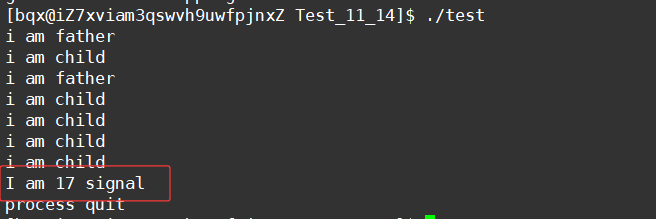 {signal(17, handler);pid_t id = fork();if (id == 0){int cnt = 0;while (cnt < 5){printf("i am child\n");sleep(1);cnt++;}}else if (id > 0){int ret = 0;while (ret < 2){printf("i am father\n");ret++;sleep(1);}pid_t rid = waitpid(id, nullptr, 0);if (rid == id){printf("process quit\n");}}return 0;