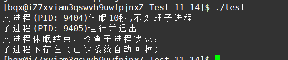 int main() {// 1. 配置sigaction,忽略SIGCHLD信号struct sigaction sa;sa.sa_handler = SIG_IGN; // 设置为忽略sigemptyset(&sa.sa_mask);sa.sa_flags = 0;if (sigaction(SIGCHLD, &sa, NULL) == -1) {perror("sigaction failed");exit(1);}// 2. fork子进程pid_t pid = fork();if (pid == -1) {perror("fork failed");exit(1);}if (pid == 0) {printf("子进程(PID: %d)运行并退出\n", getpid());exit(0);} else {// 父进程:休眠10秒,期间不调用wait()printf("父进程(PID: %d)休眠10秒,不处理子进程\n", getpid());sleep(10);// 3. 验证子进程是否为僵尸进程printf("父进程休眠结束,检查子进程状态:\n");// 尝试wait子进程(实际已被系统自动清理)pid_t wait_pid = waitpid(pid, NULL, WNOHANG);if (wait_pid == 0) {printf("子进程仍存在(可能是僵尸进程)\n");} else if (wait_pid == pid) {printf("子进程已被清理(无僵尸进程)\n");} else {printf("子进程不存在(已被系统自动回收)\n");}}return 0; }