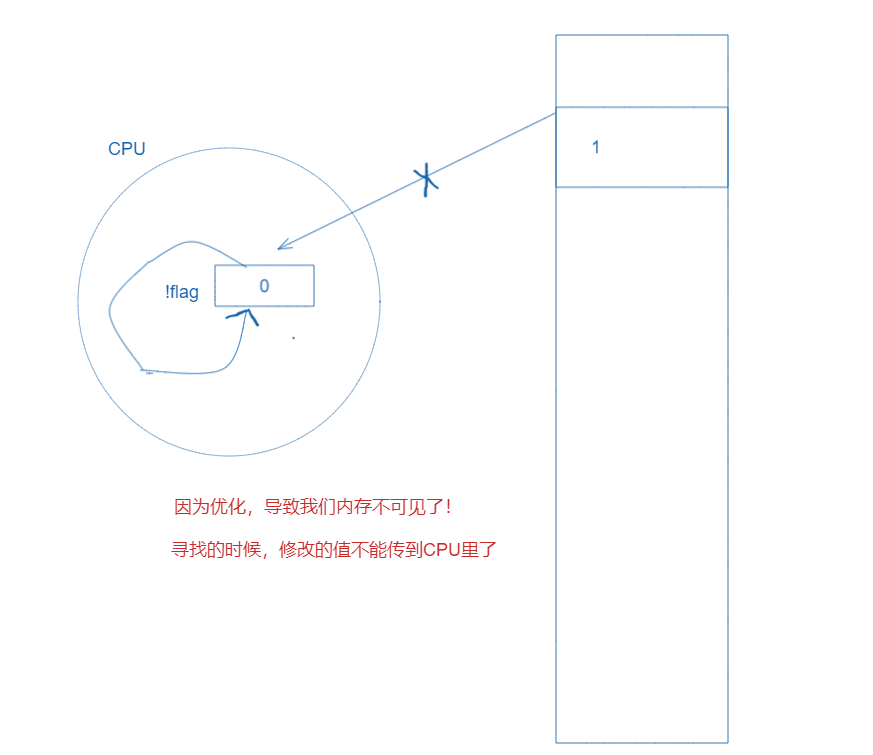 优化情况下,键入 CTRL-C ,2号信号被捕捉,执行自定义动作,修改 flag=1 ,但是 while 条件依旧满足,进程继续运行!但是很明显flag肯定已经被修改了,但是为何循环依旧执行?很明显, while 循环检查的flag,并不是内存中最新的flag,这就存在了数据二异性的问题。 while 检测的flag其实已经因为优化,被放在了CPU寄存器当中。如何解决呢?