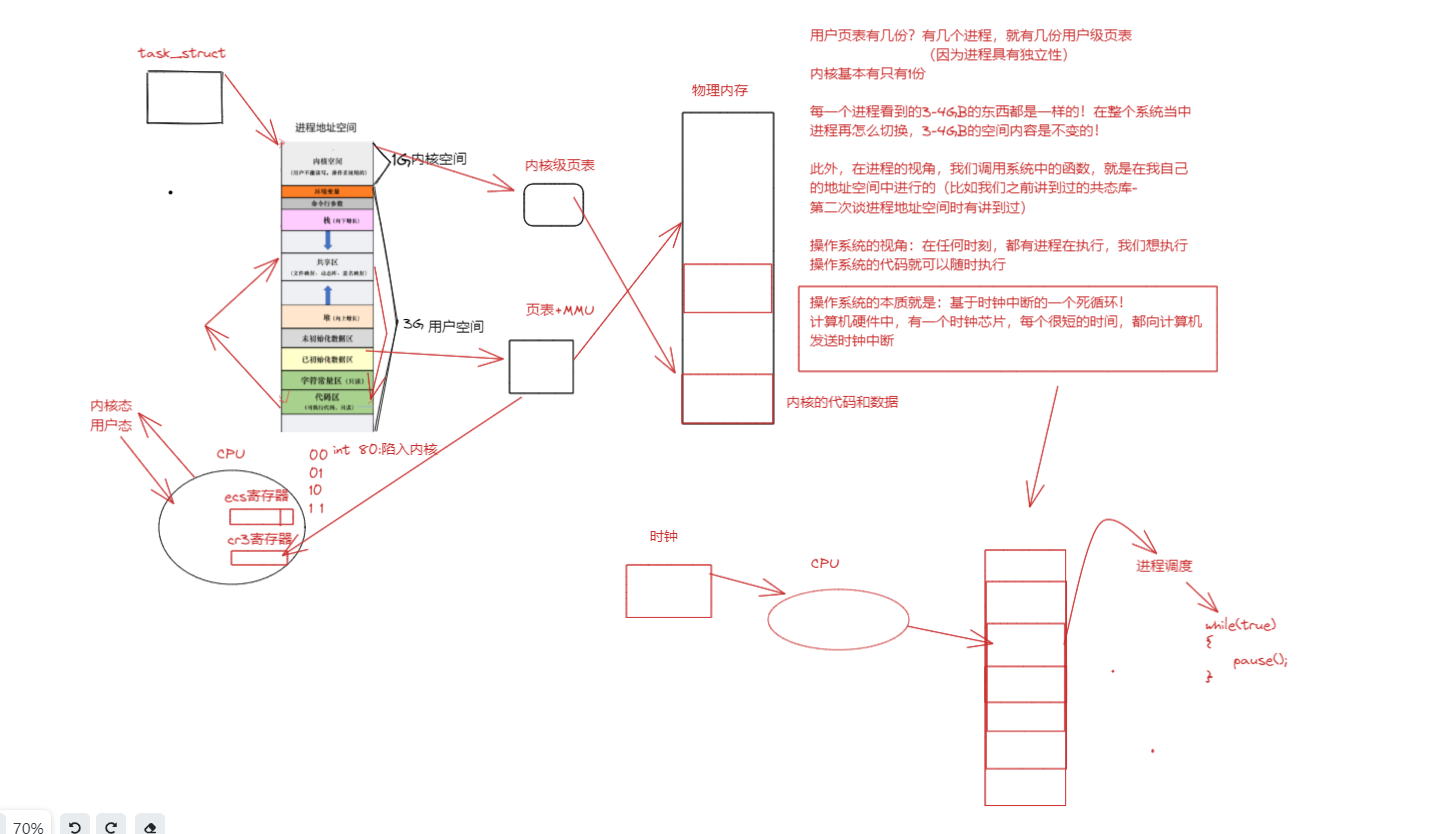 3. 系统调用处理:内核通过寄存器(如 eax 存系统调用号、 ebx/ecx 存参数)识别请求,执行对应的内核函数,处理完后再返回用户态。