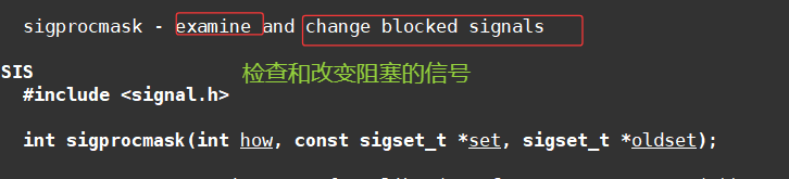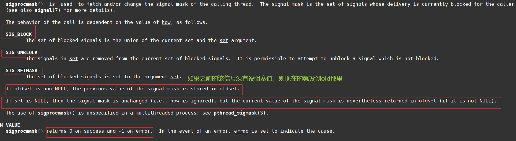 如果oldset是非空指针,则读取进程的当前信号屏蔽字通过oldset参数传出。如果set是非空指针,则 更改进程的信号屏蔽字,参数how指示如何更改。如果oldset和set都是非空指针,则先将原来的信号 屏蔽字备份到oset里,然后根据set和how参数更改信号屏蔽字。假设当前的信号屏蔽字为mask,下表说明了how参数的可选值