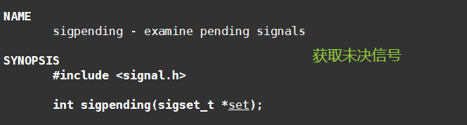 {//定义信号集,并完成初始化sigset_t s,y;sigemptyset(&s);//增加信号sigaddset(&s,2);//设置阻塞信号集,阻塞SIGINT信号sigprocmask(SIG_BLOCK,&s,NULL);// 获取未决信号集while(true){sigpending(&y);PrintSig(&y);sleep(1);}return 0;