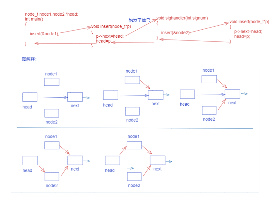 main函数调用insert函数向一个链表head中插入节点node1,插入操作分为两步,刚做完第一步的 时候,因为硬件中断使进程切换到内核,再次回用户态之前检查到有信号待处理,于是切换 到sighandler函数,sighandler也调用insert函数向同一个链表head中插入节点node2,插入操作的 两步都做完之后从sighandler返回内核态,再次回到用户态就从main函数调用的insert函数中继续 往下执行,先前做第一步之后被打断,现在继续做完第二步。结果是,main函数和sighandler先后 向链表中插入两个节点,而最后只有一个节点真正插入链表中了