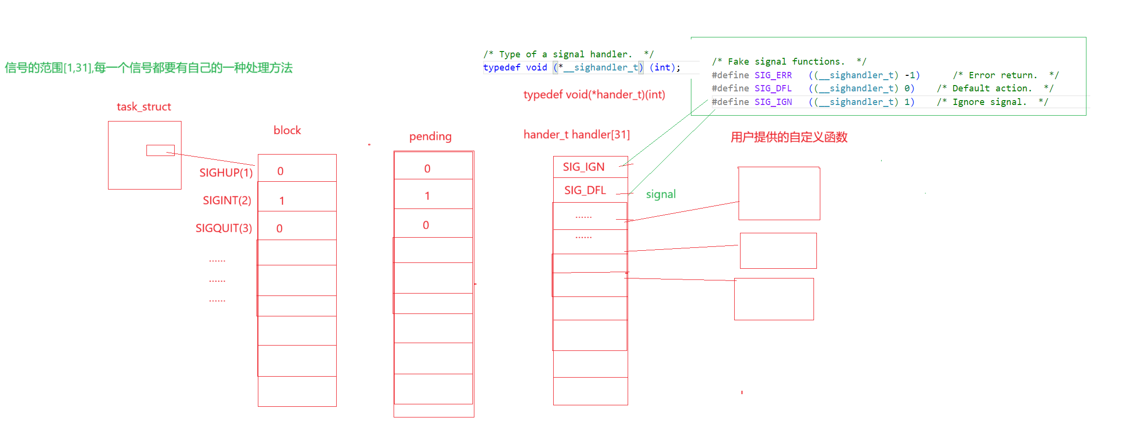 值为void,可以带一个int参数,通过参数可以得知当前信号的编号,这样就可以用同一个函数处理多种信