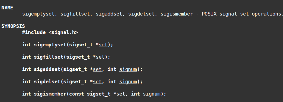 sigset_t类型对于每种信号用一个bit表示“有效”或“无效”状态,至于这个类型内部如何存储这些bit则依赖于系统实现,从使用者的角度是不必关心的,使用者只能调用以下函数来操作sigset_ t变量,而不应该对它的内部数据做任何解释,比如用printf直接打印sigset_t变量是没有意义的