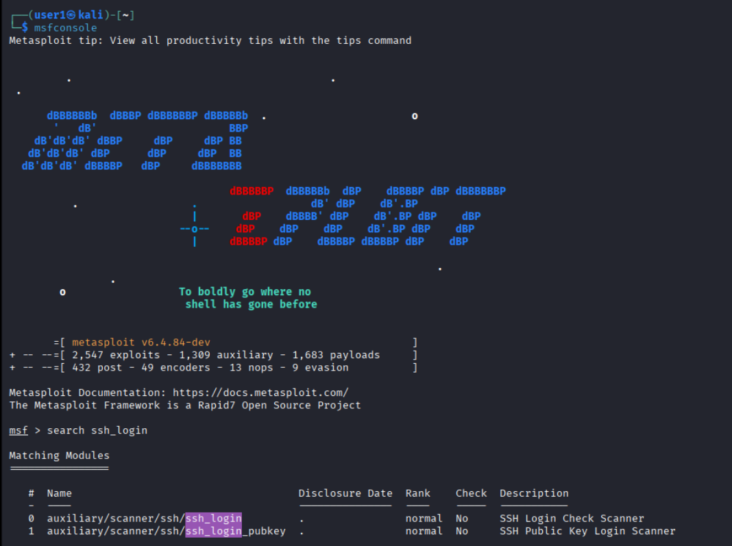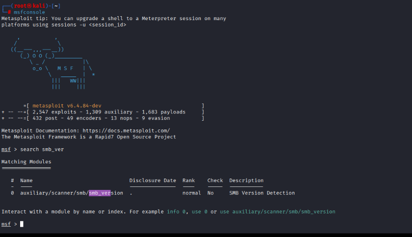 输入msfconsole命令,打开 Metasploit 是一个广泛使用的安全测试框架