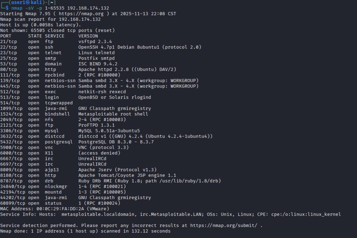 nmap -sV -p 1-65535 192.168.173.132指令解释: