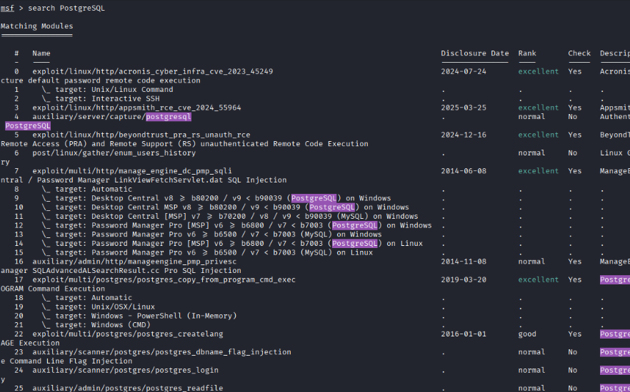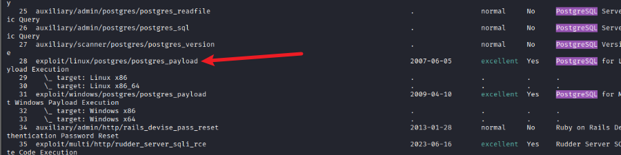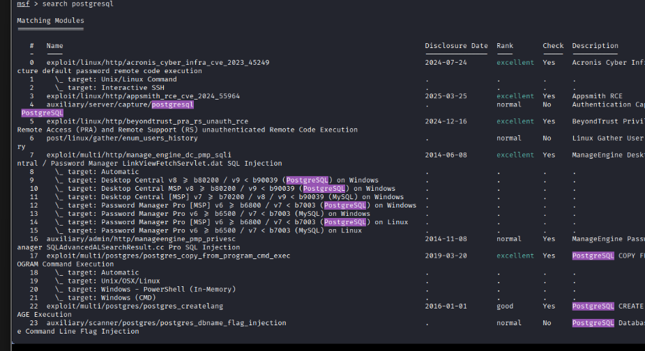 这里在msfconsole搜索一下有无PostgreSQL的漏洞,命令如下
