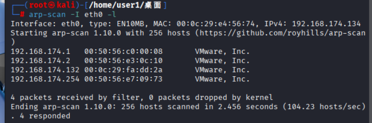 使用arp-scan工具进行一个基于ARP协议发现活跃的设备,这个命令是通过向网络中所有的设备发送ARP请求,来进行相应,从而识别到网络中活跃的设备。