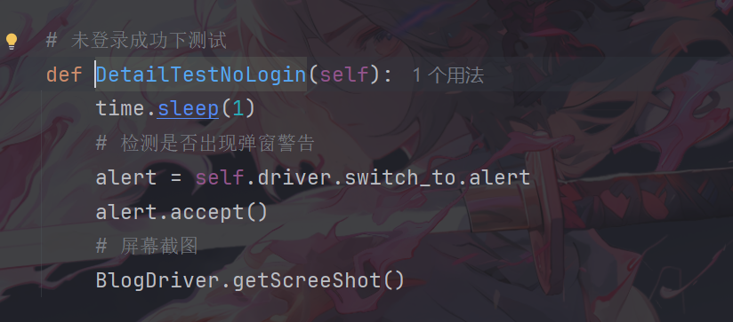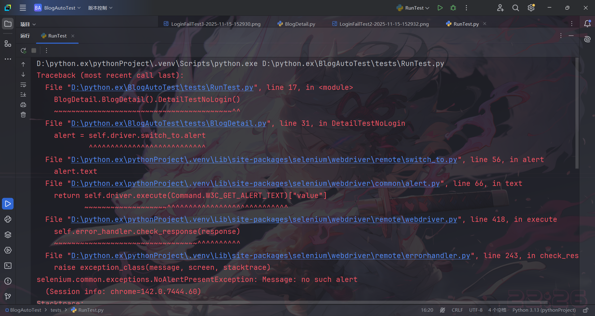 这里我们可以看到出现了这样一个报错,根据内容我们大概知道是BlogDetail.BlogDetail().DetailTestNoLogin()中alert = self.driver.switch_to.alert 这部分报出的错误,所以此时我们首先需要查看代码思路与测试用例的要求是否相符。