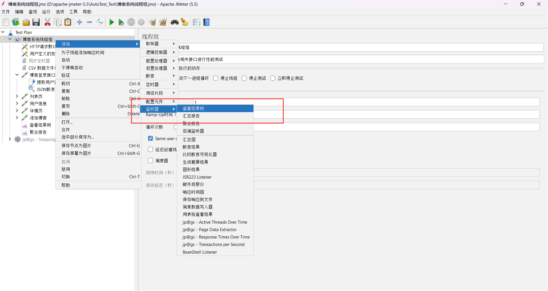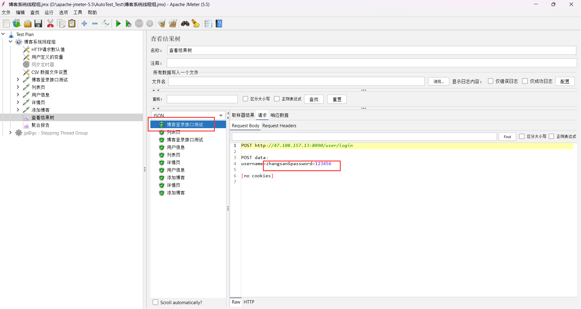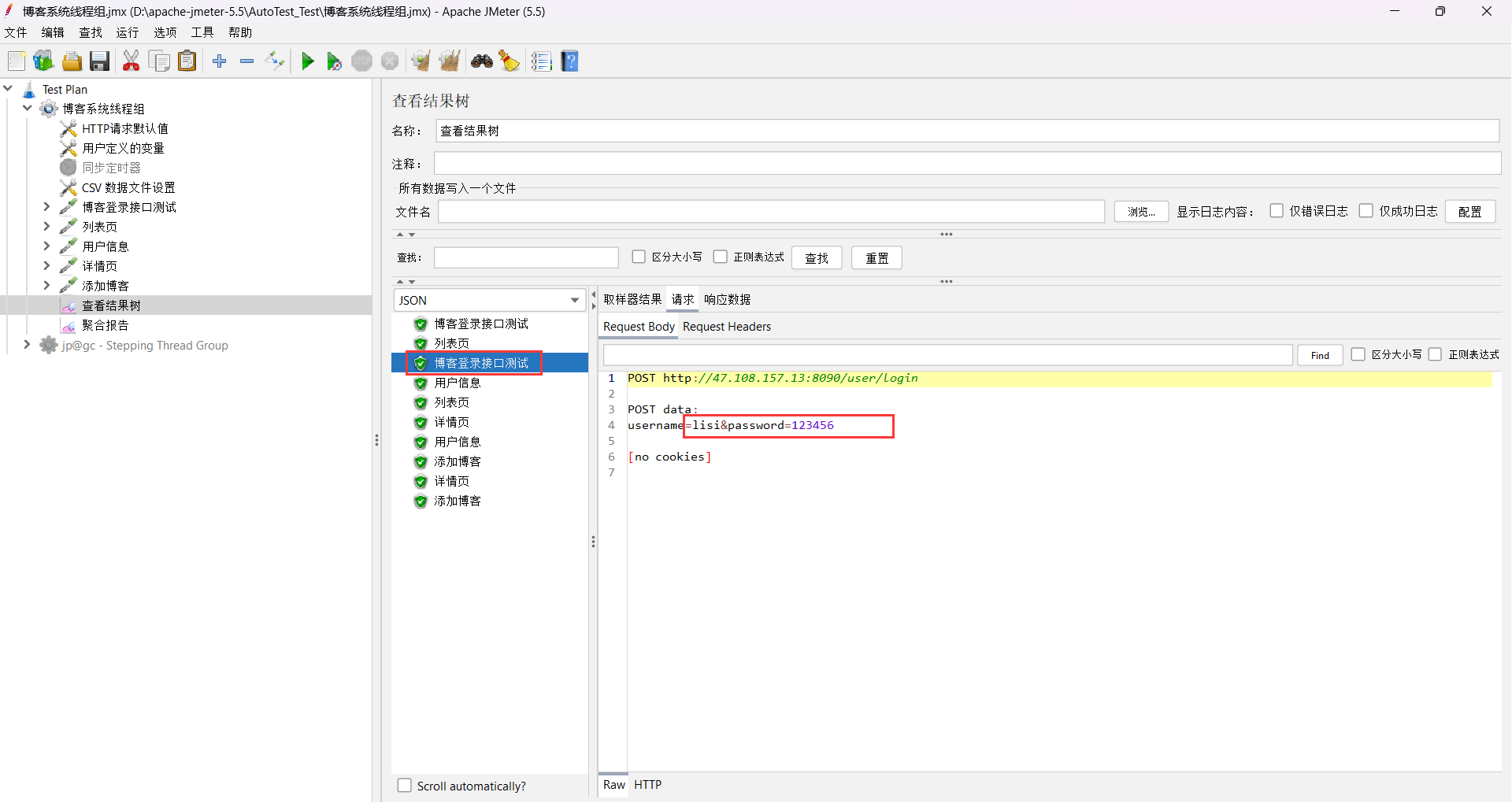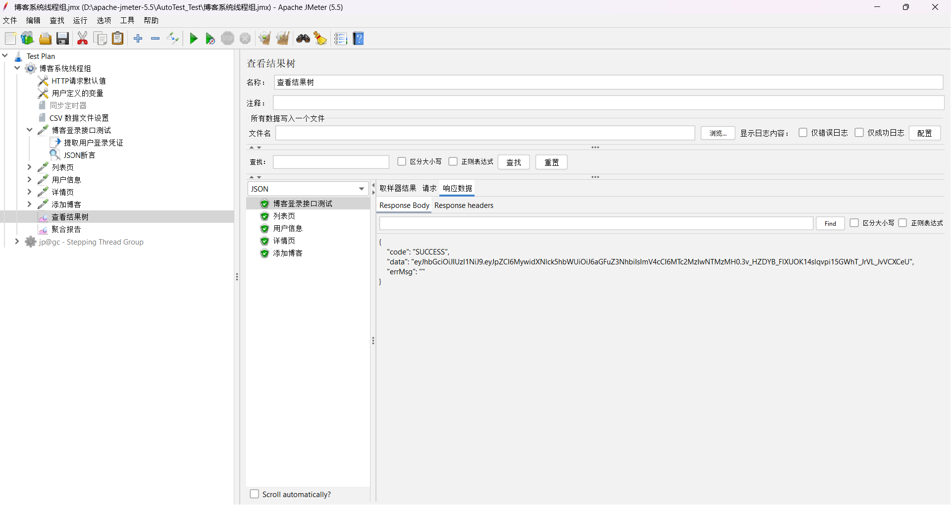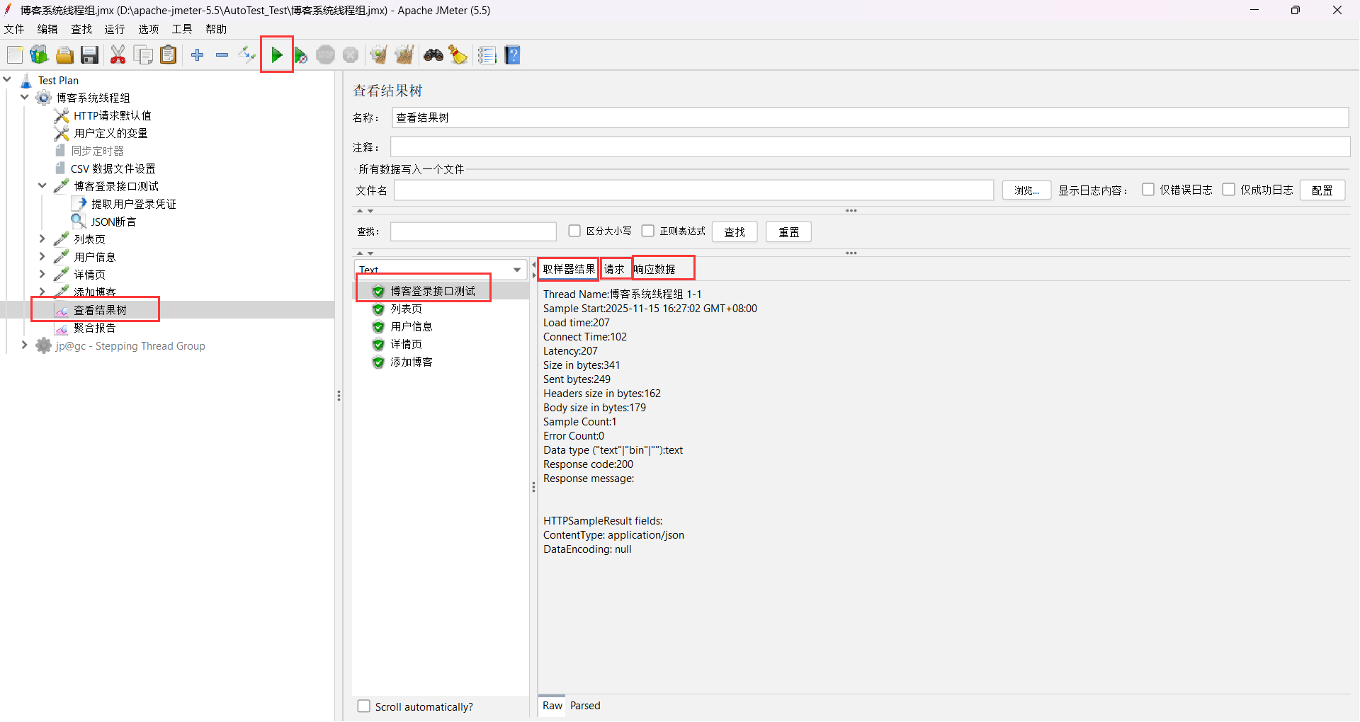 这里我们创建一个结果树来查看结果,注意此时虽然登录接口测试的图标显示通过,但是,我们这里也需要逐个查看取样结果、请求、响应数据中的信息是否出现异常来判断是否真正的访问成功了。