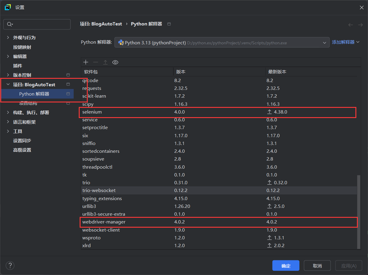 安装好两个库之后,我们可以在设置里的项目的解释器中查看是否安装成功: