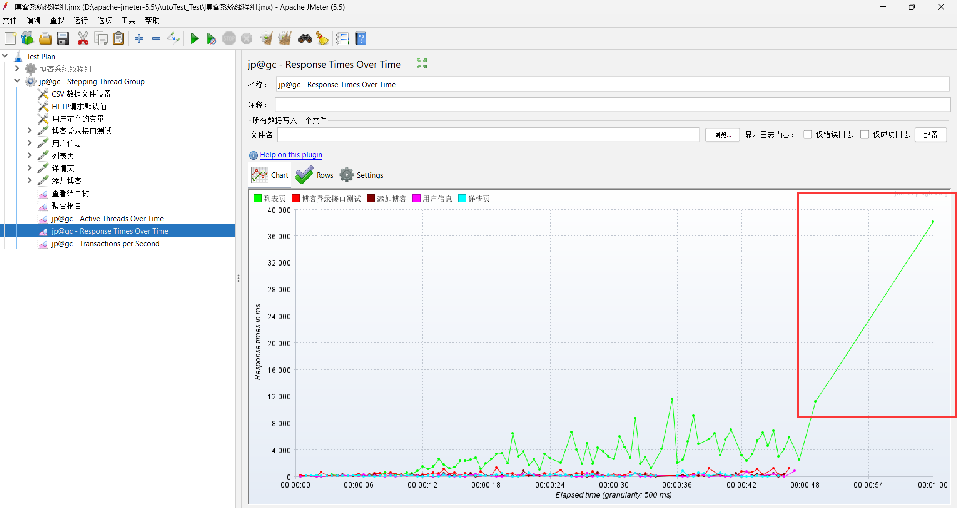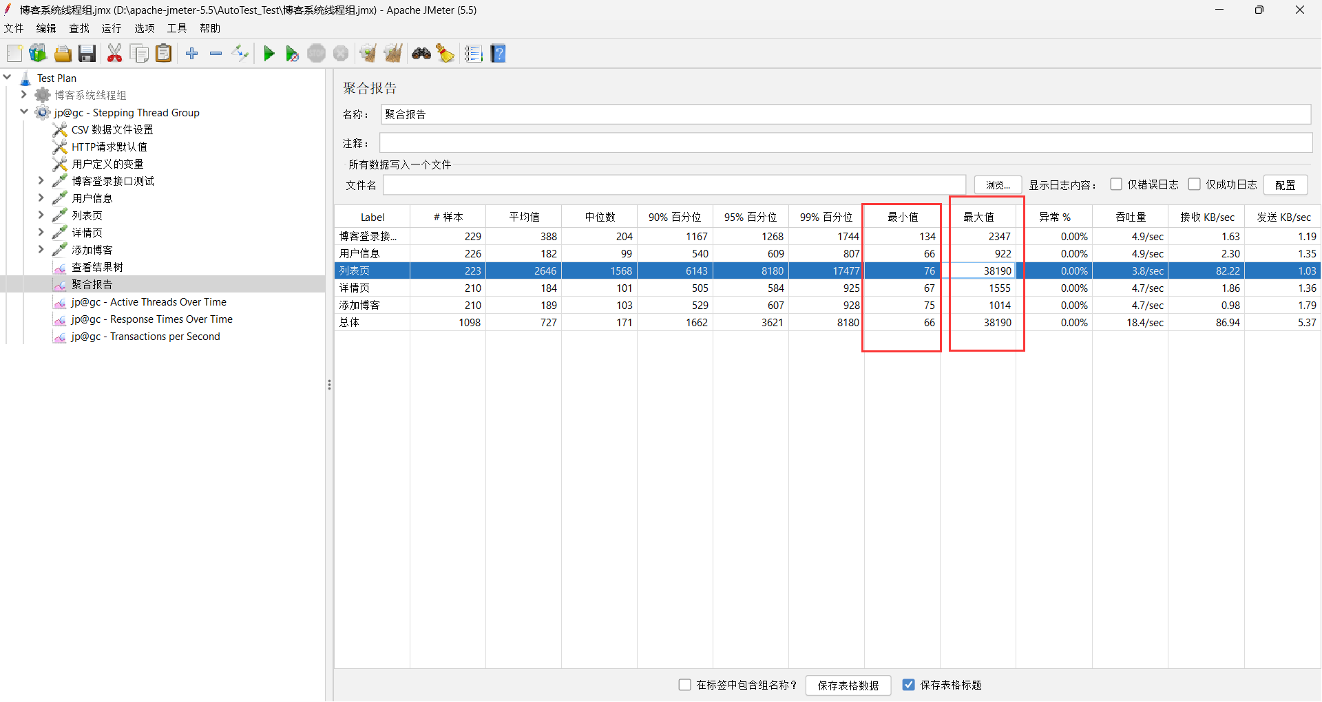 在聚合报告里面也可以看到:列表页的执行时间超出其他页面很多,说明是列表页的一个进程出了问题