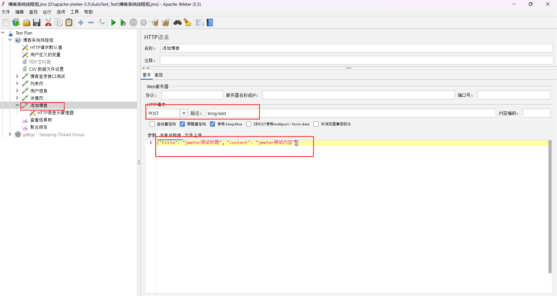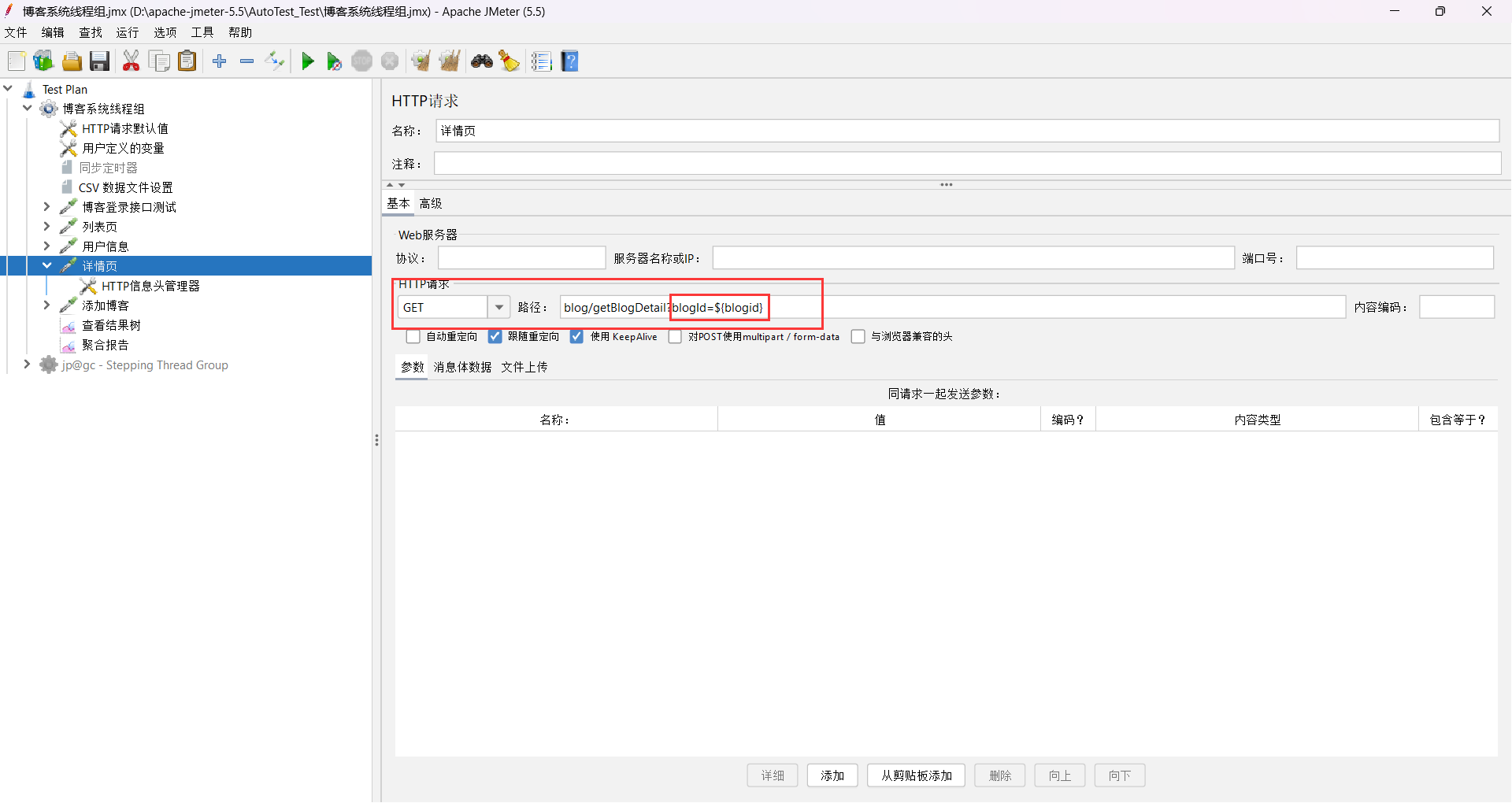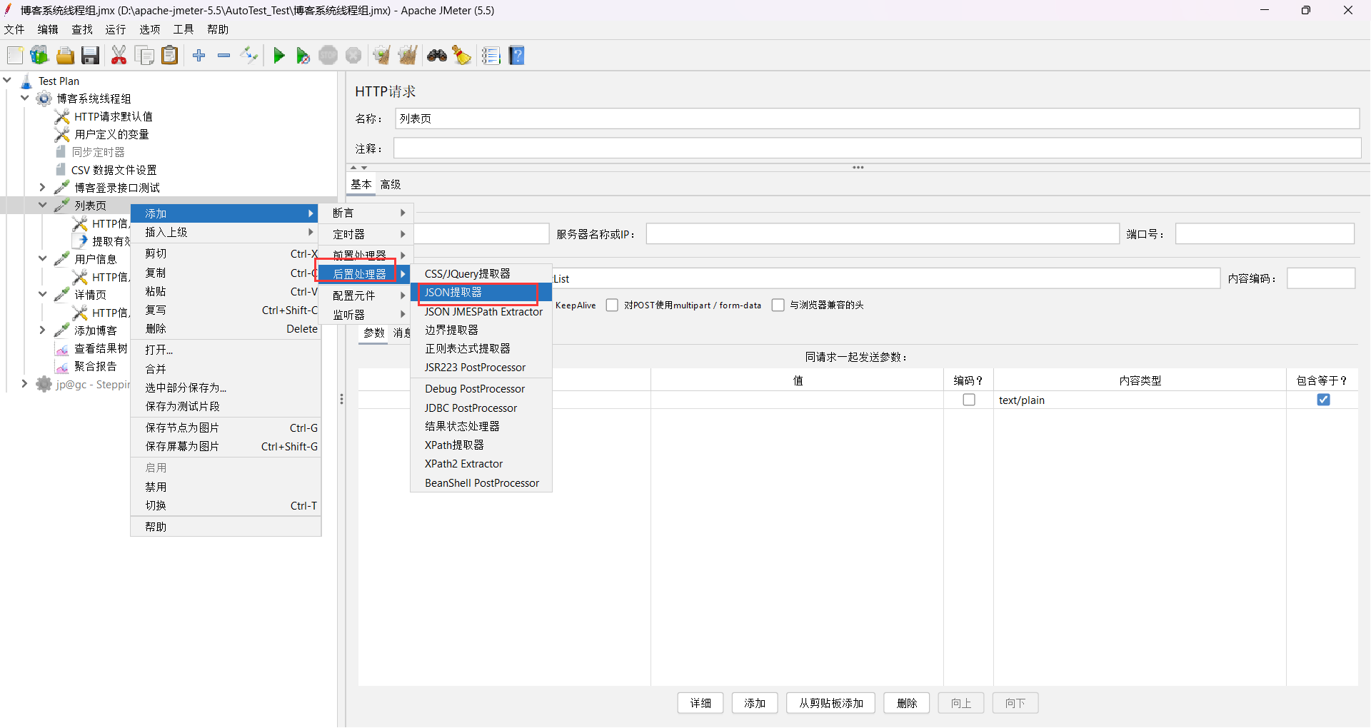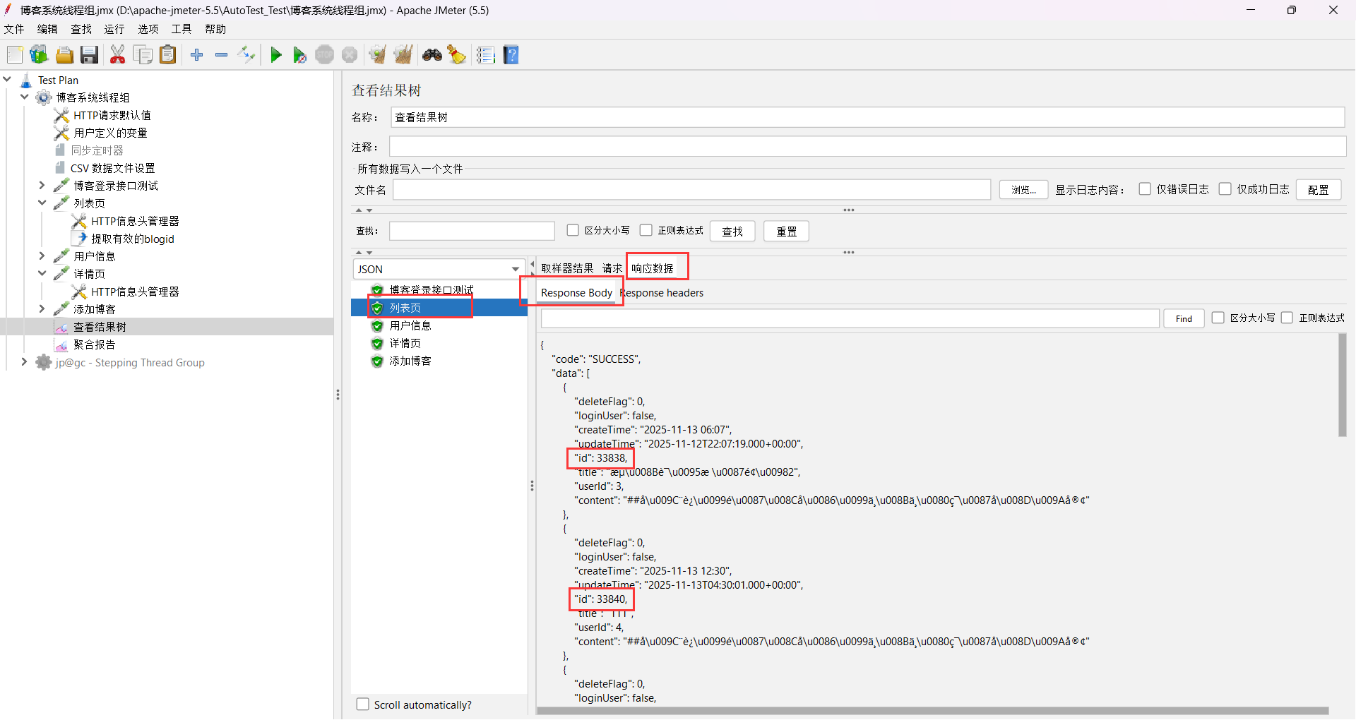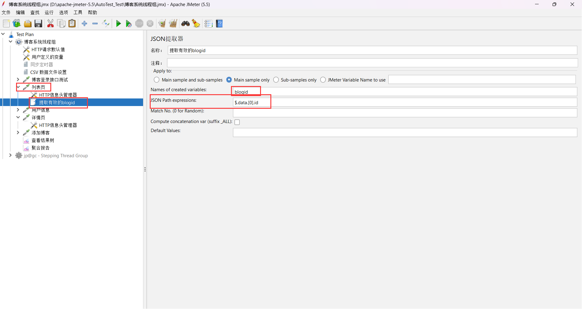 通过列表页的返回数据我们可以发现,现在又可以使用json提取器了,把json提取器放到博客列表页里面提取博客文章的id