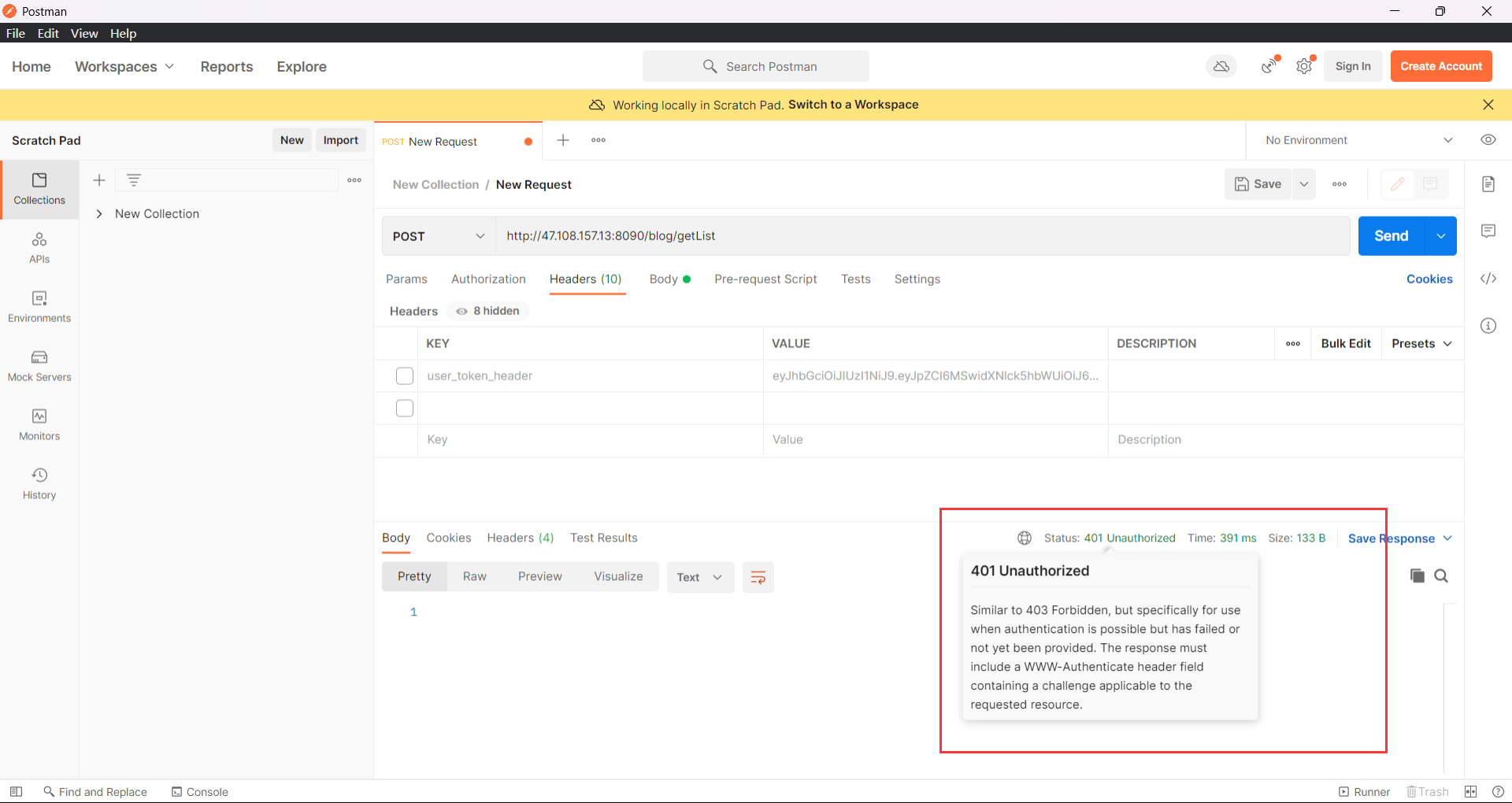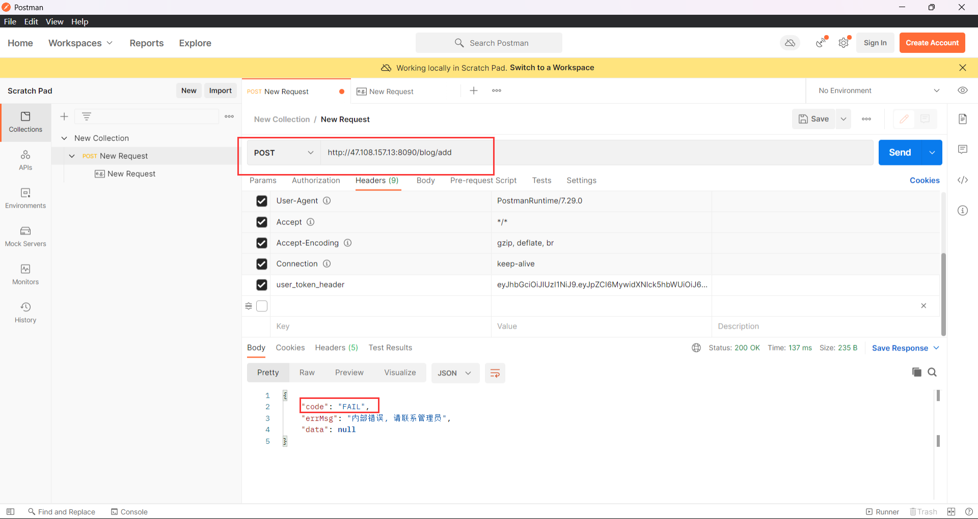 发布完成后我们得到一个add这就是发布博客的url,此时如果将这一路径直接放在postman中去执行我们会发现,返回结果出错了,那么如何解决呢?