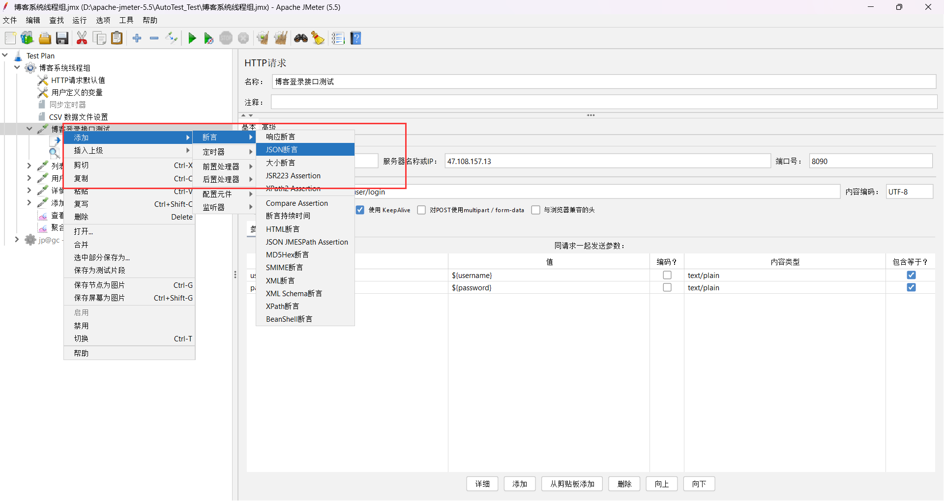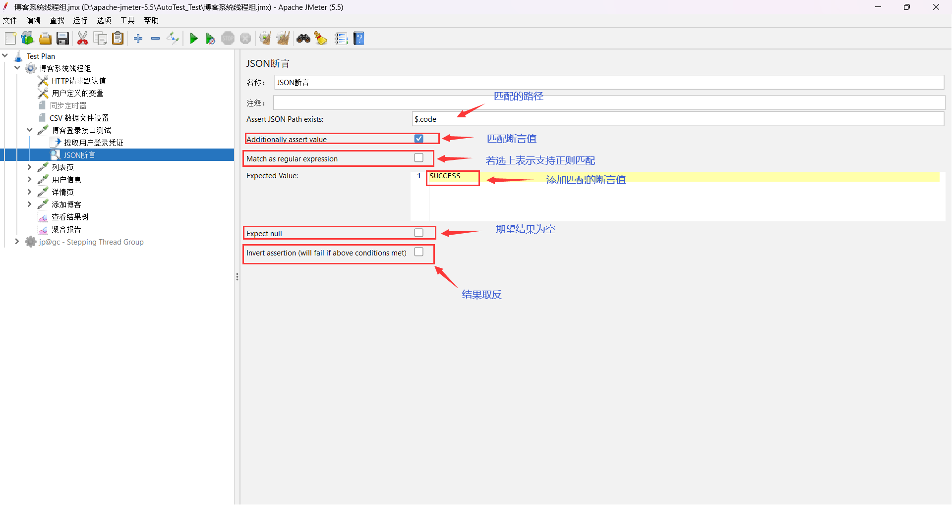 为什么要添加JSON断言呢?因为我们开启多线程(虚拟用户的数量增加)我们不可能一个一个去查看结果的反馈是否符合我们的预期