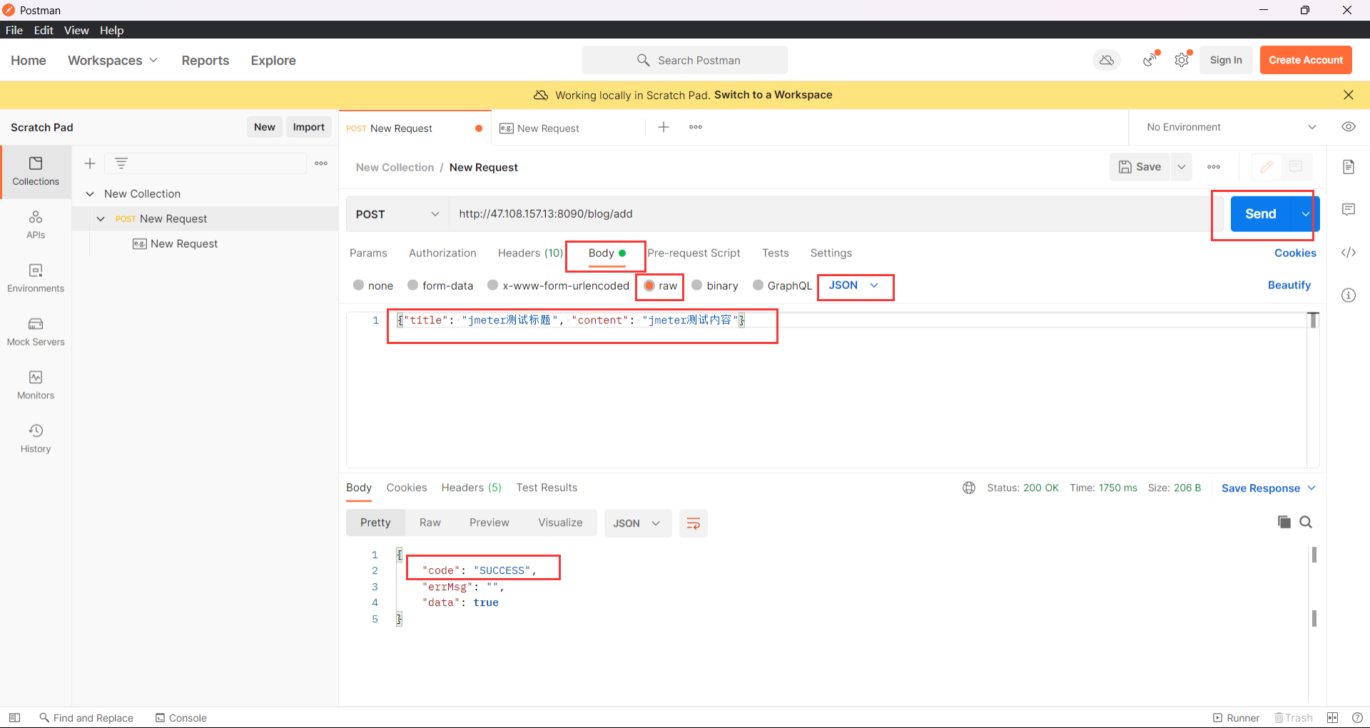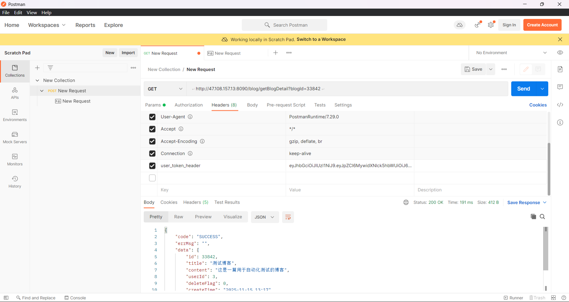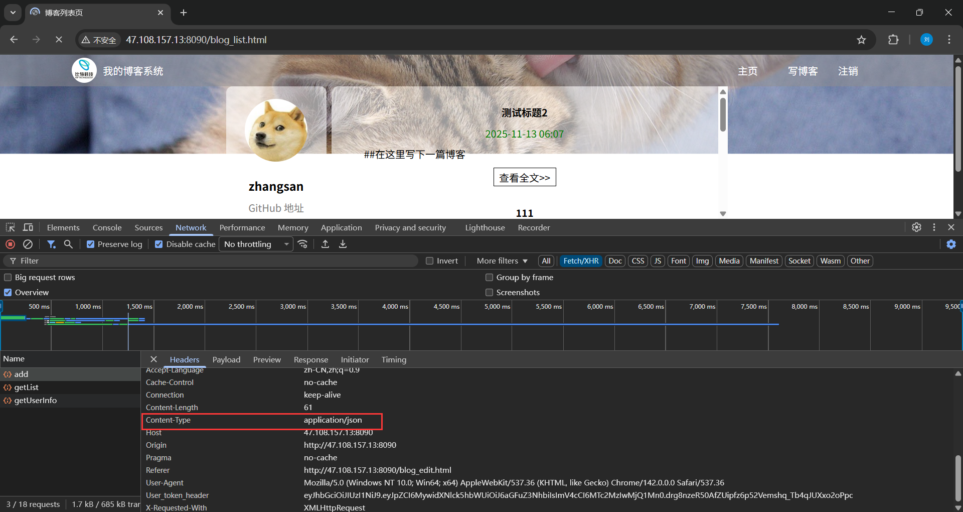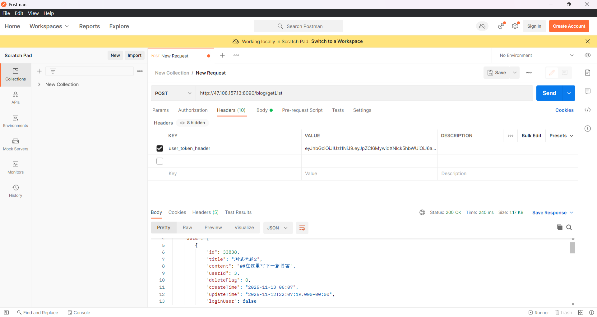 通过查看我们发现这里输入json格式,因此我们这里需要在请求Body里加上这一请求试试。此时加上以后我们会发现我们这里就请求成功了,而且在博客中它也给我在次发了一次博客。