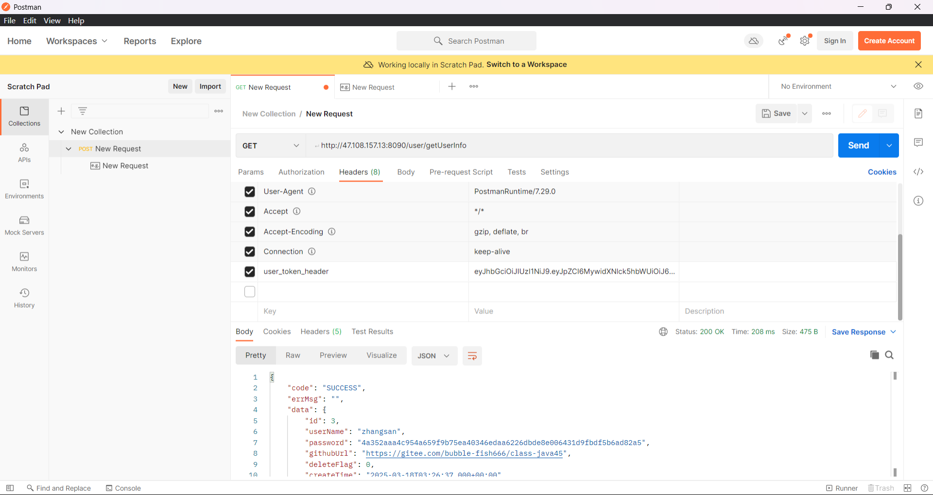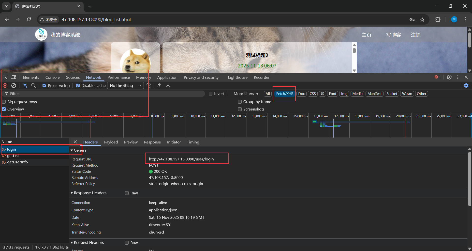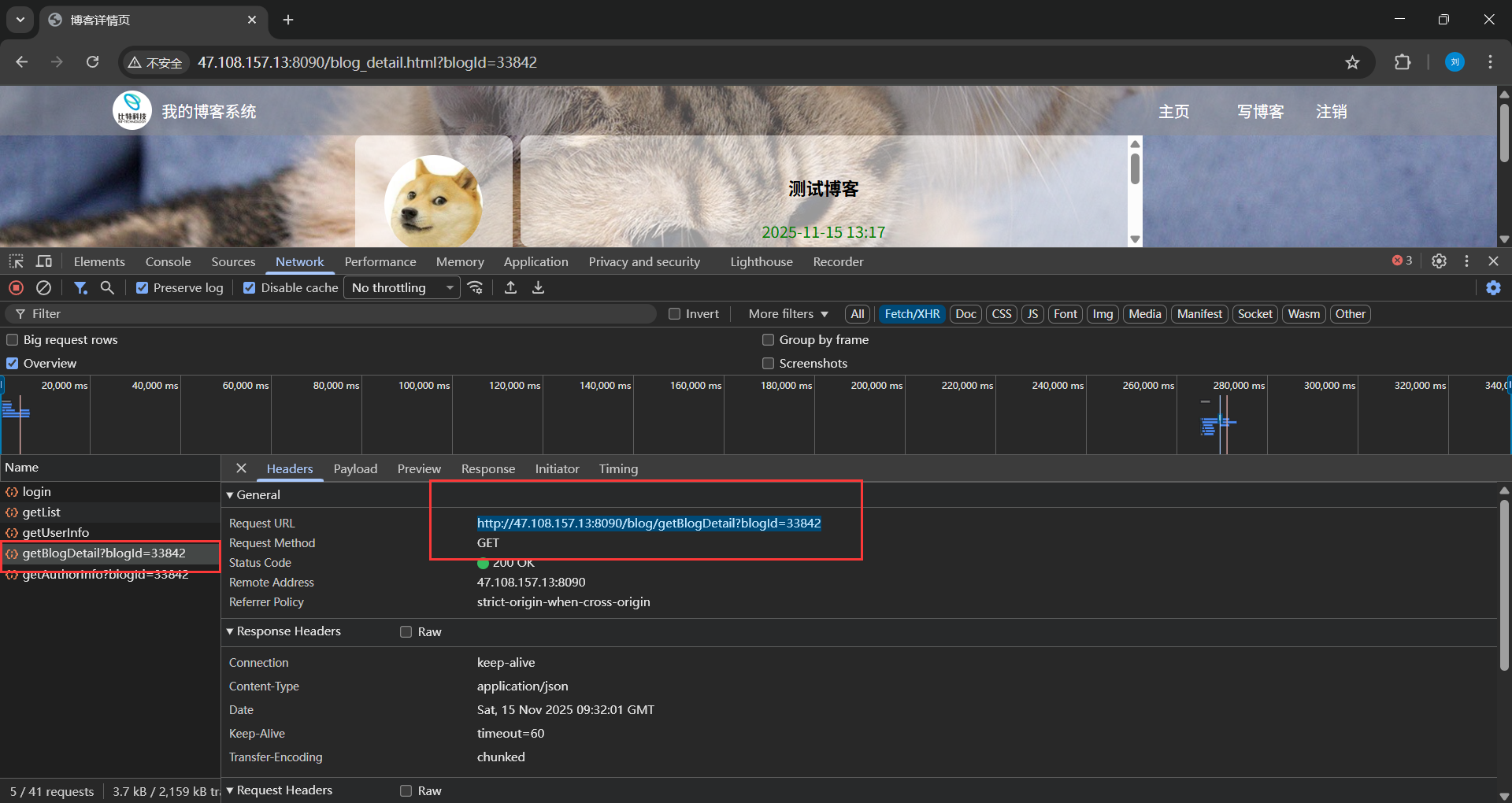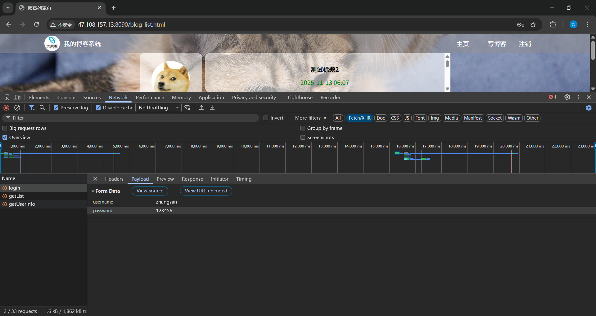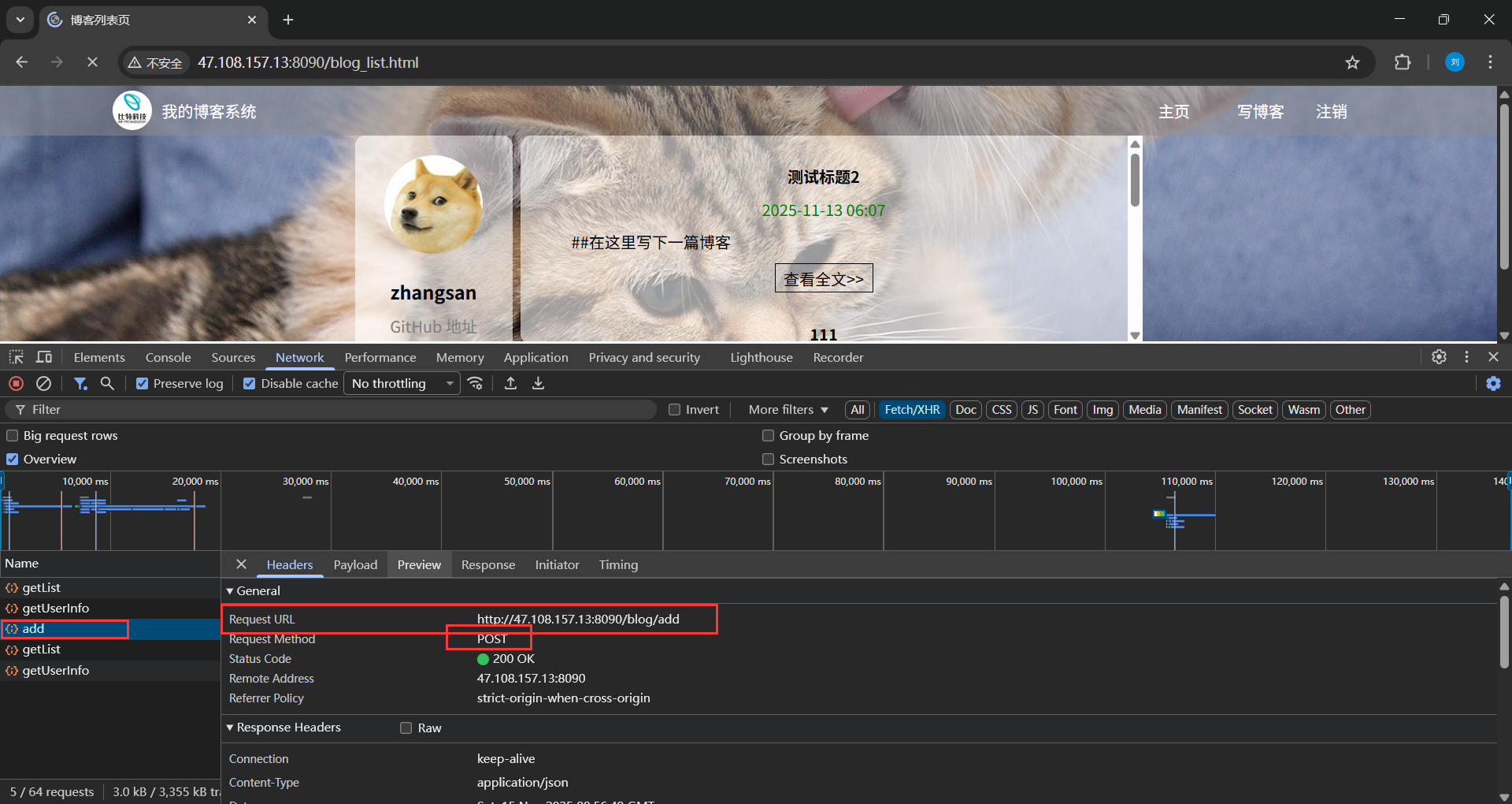 通过查看我们发现这里输入json格式,因此我们这里需要在请求Body里加上这一请求试试。此时加上以后我们会发现我们这里就请求成功了,而且在博客中它也给我在次发了一次博客。