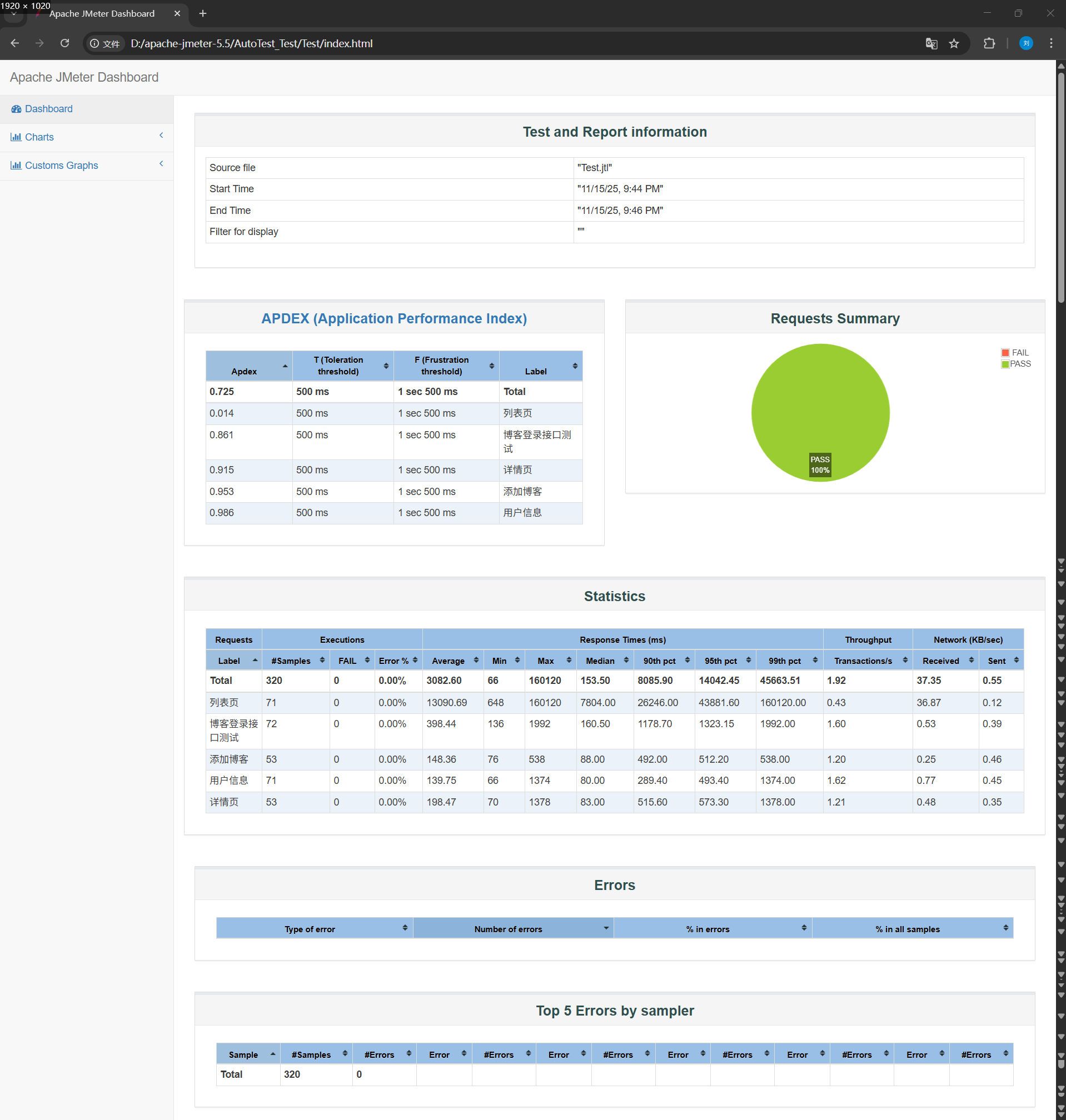 性能报告展示 测试通过率100%因此该系统能够正常处理业务