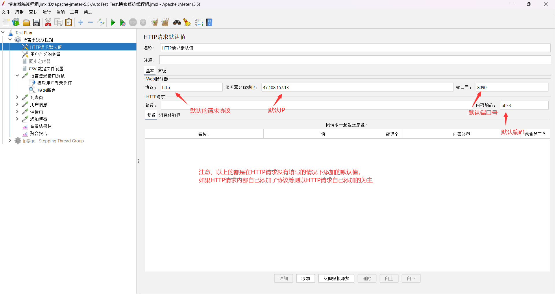 接下来我们还有许多页面进行测试但是访问的协议、IP、端口号全都相同,一个一个输入是不是效率太低了,因此,这个软件中有一个很人性化的设计那就是HTTP请求默认值。
