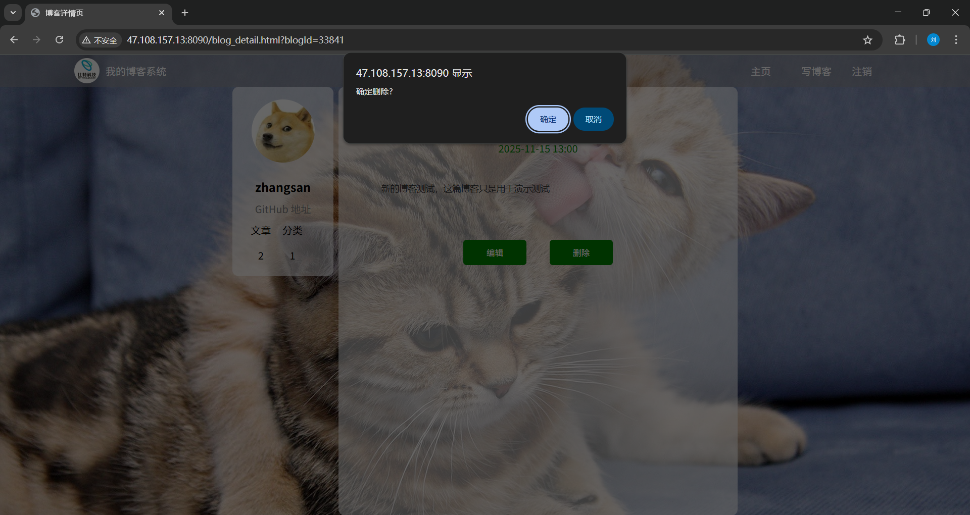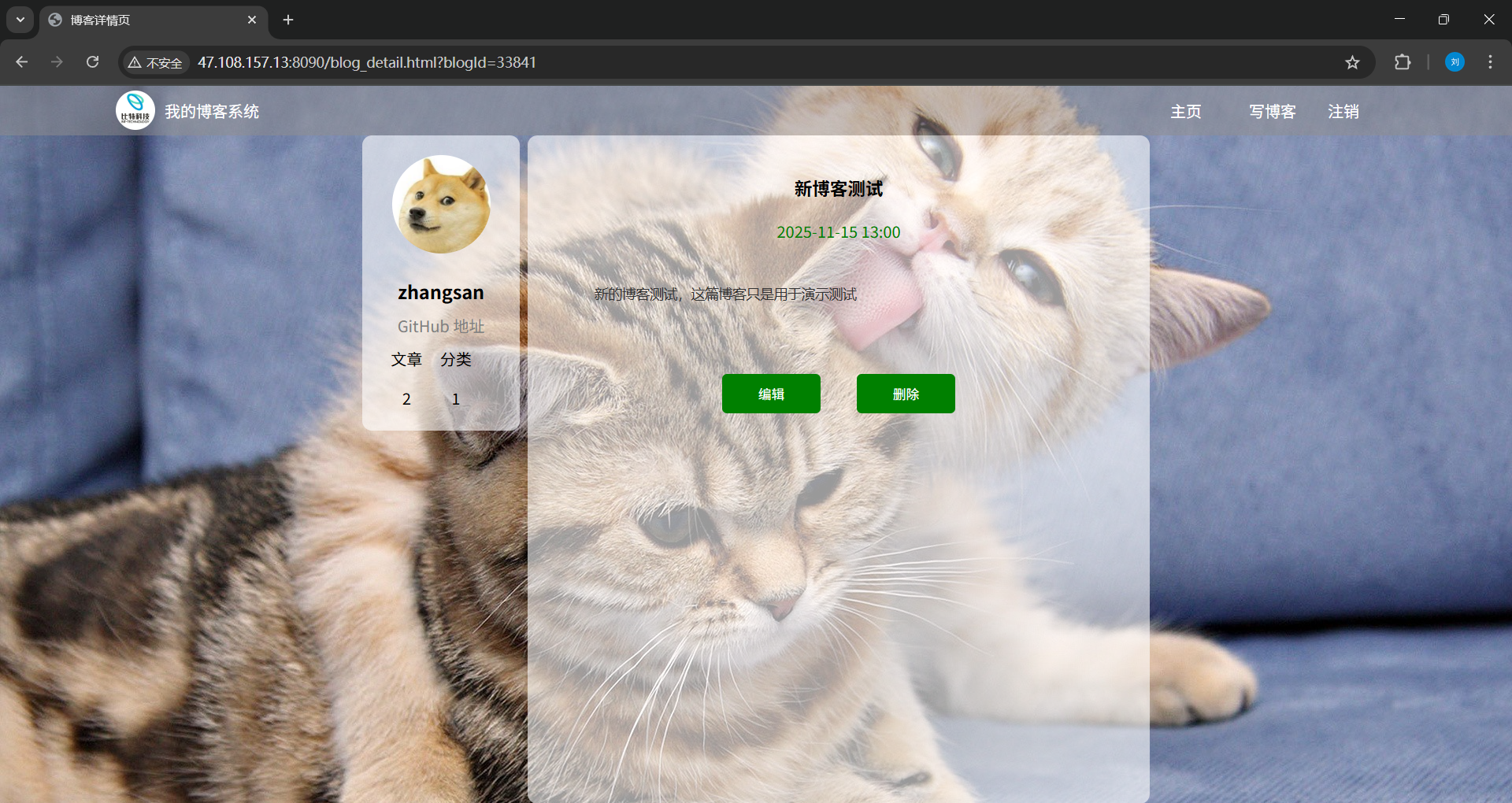进入详情页,并点击“删除”之后成功删除,如新发布的 2025-11-15 13:00 的博客就已经被成功删除。