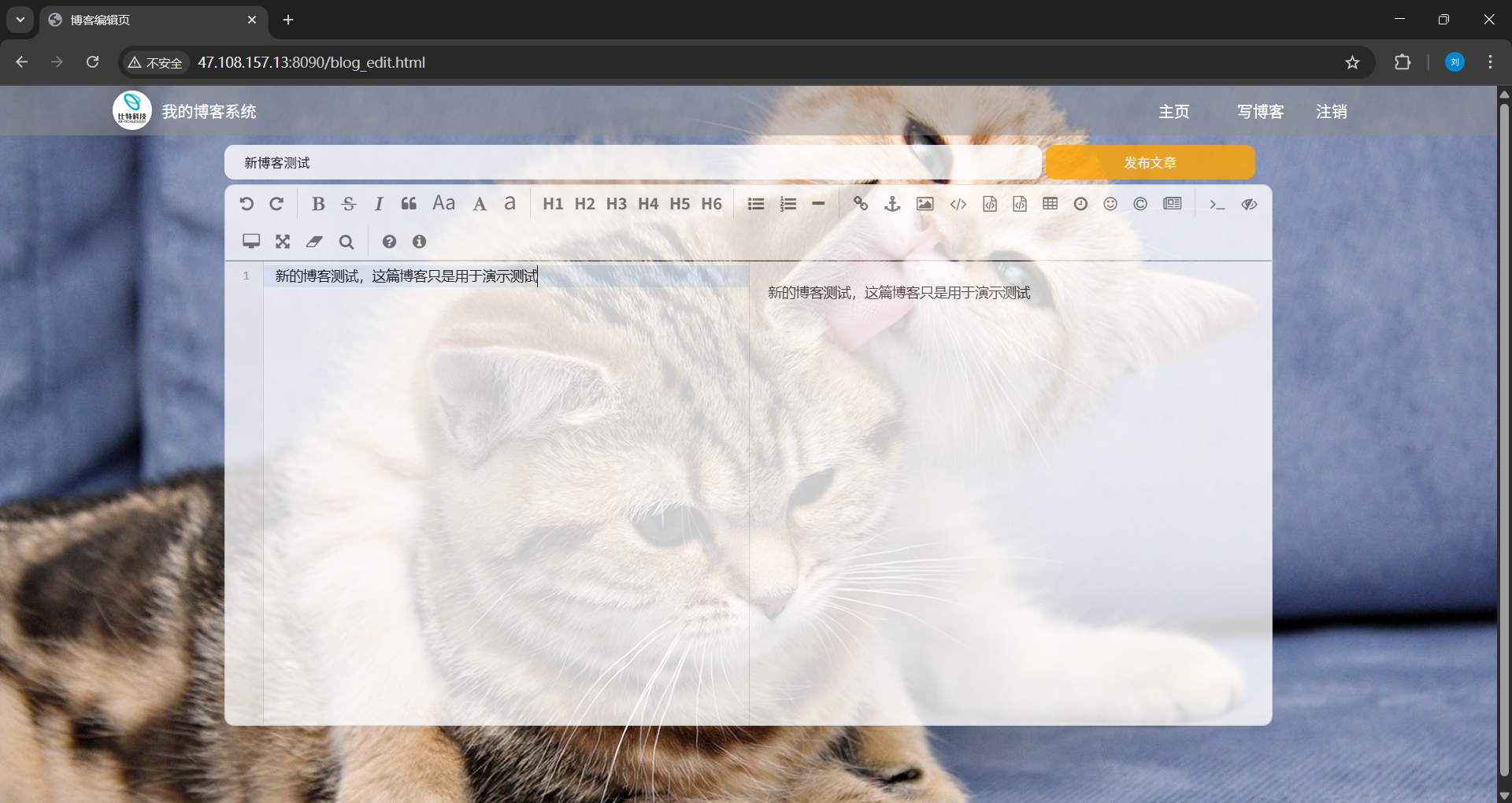 写博客:在登录之后的任意界面点击“写博客”之后就会进入博客编辑页面,此时就可以进行博客的编写,点击“发布文章”后就可以成功发布文章,此时就会跳转到列表页。