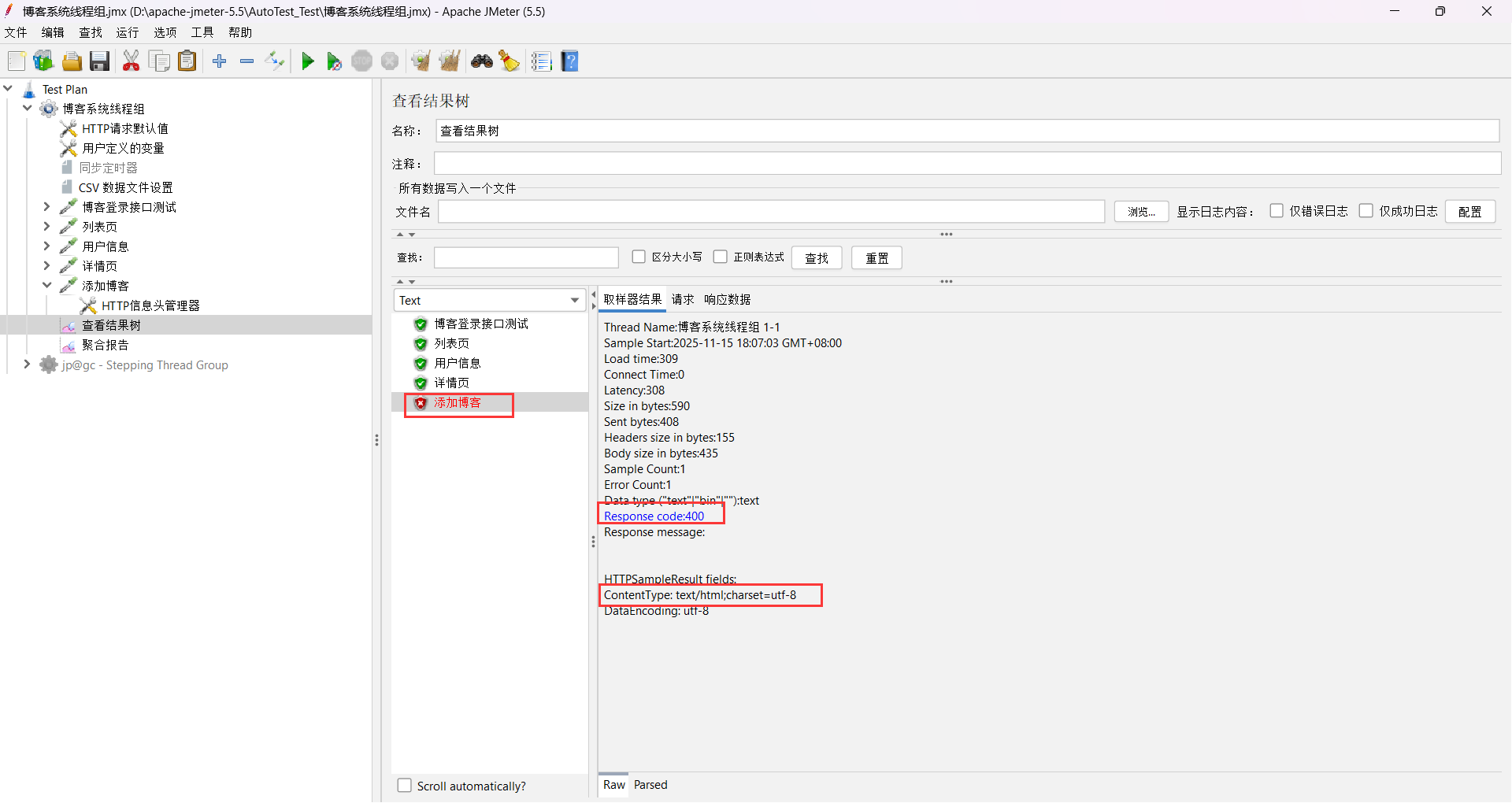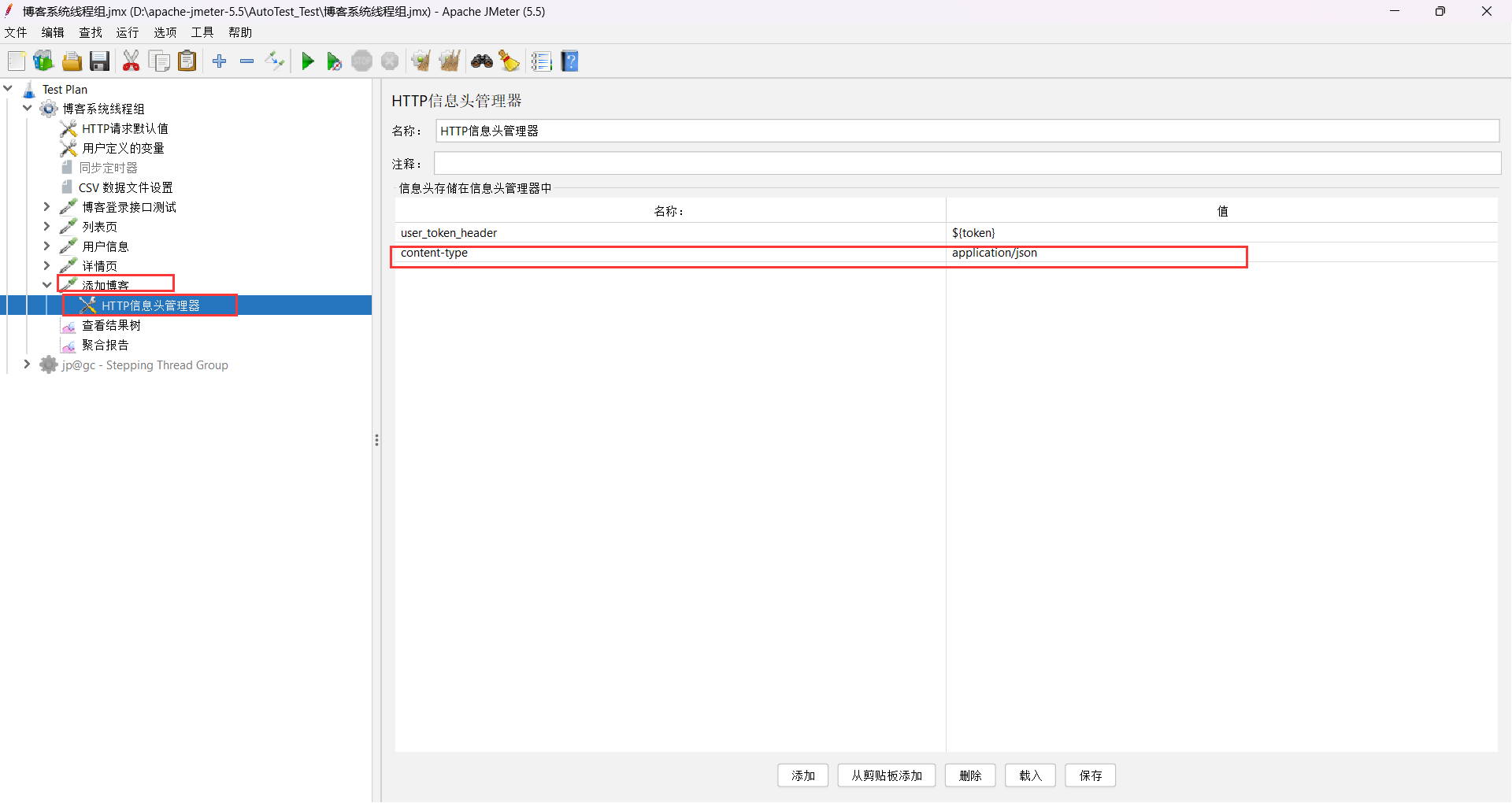 通过观察我们发现,我们在jmeter里的请求头中的 ContentType 与浏览器中的请求不同,那么此时我们就能够猜出错误的原因了,接下来我们修改一下请求: