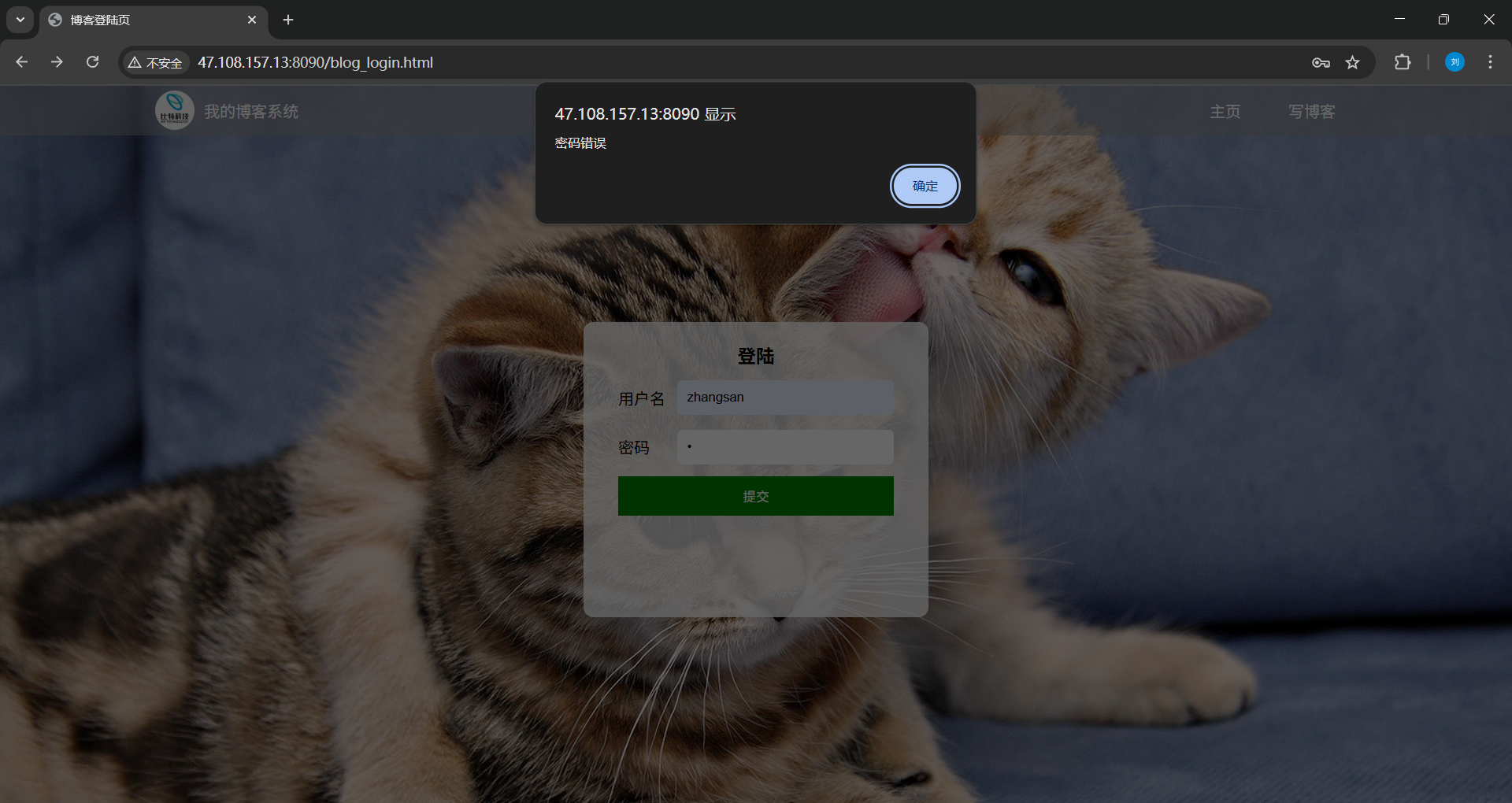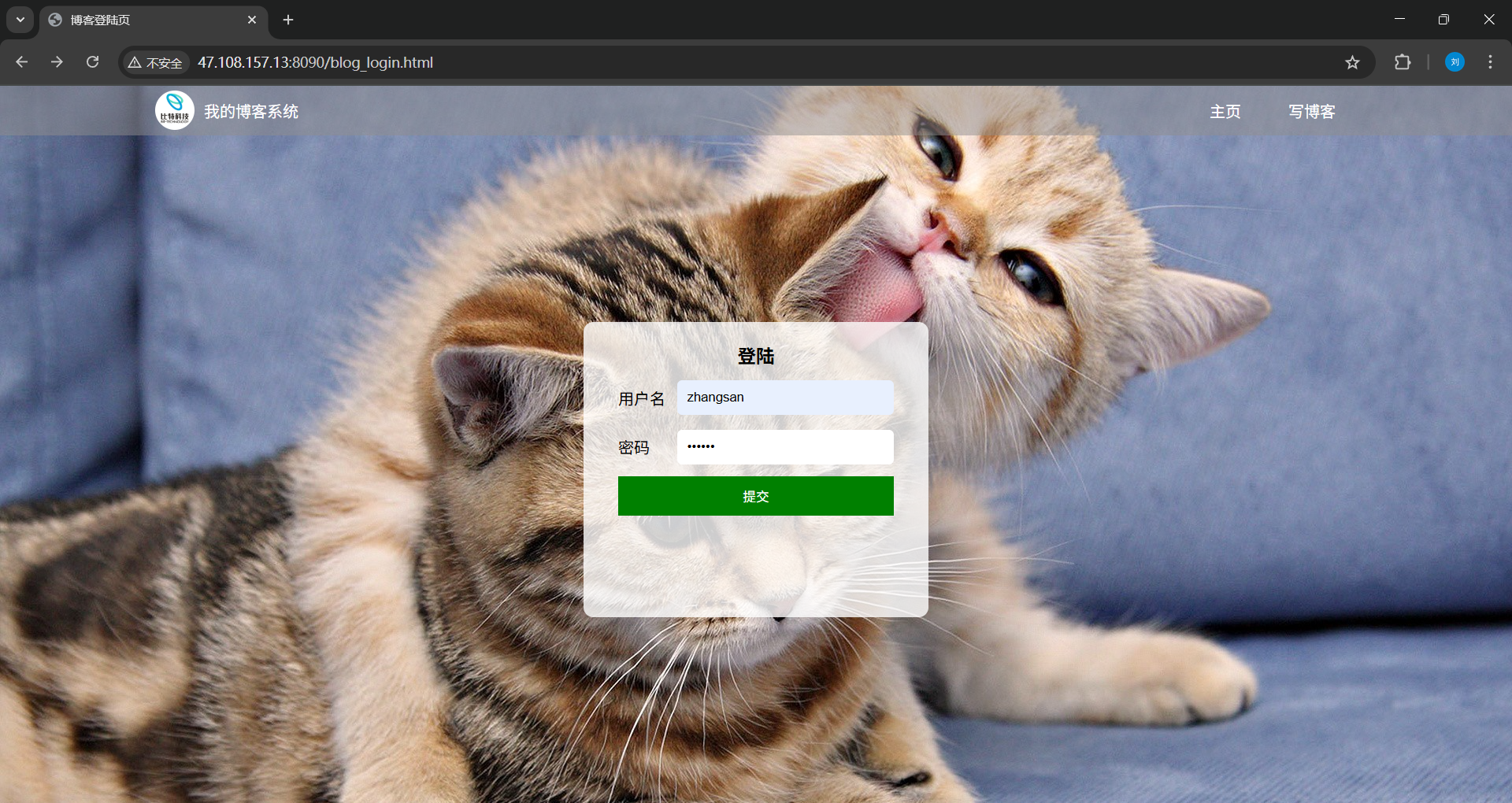 登录功能:用户名以及密码已经在后端写入了数据库,没有实现账户注册功能,即:用户名以及密码是已经存在的。登录成功后就会跳转到列表页面。在右上角存在主页和写博客两个按钮,但是在未登录情况下按下均只会跳转到登录页面。