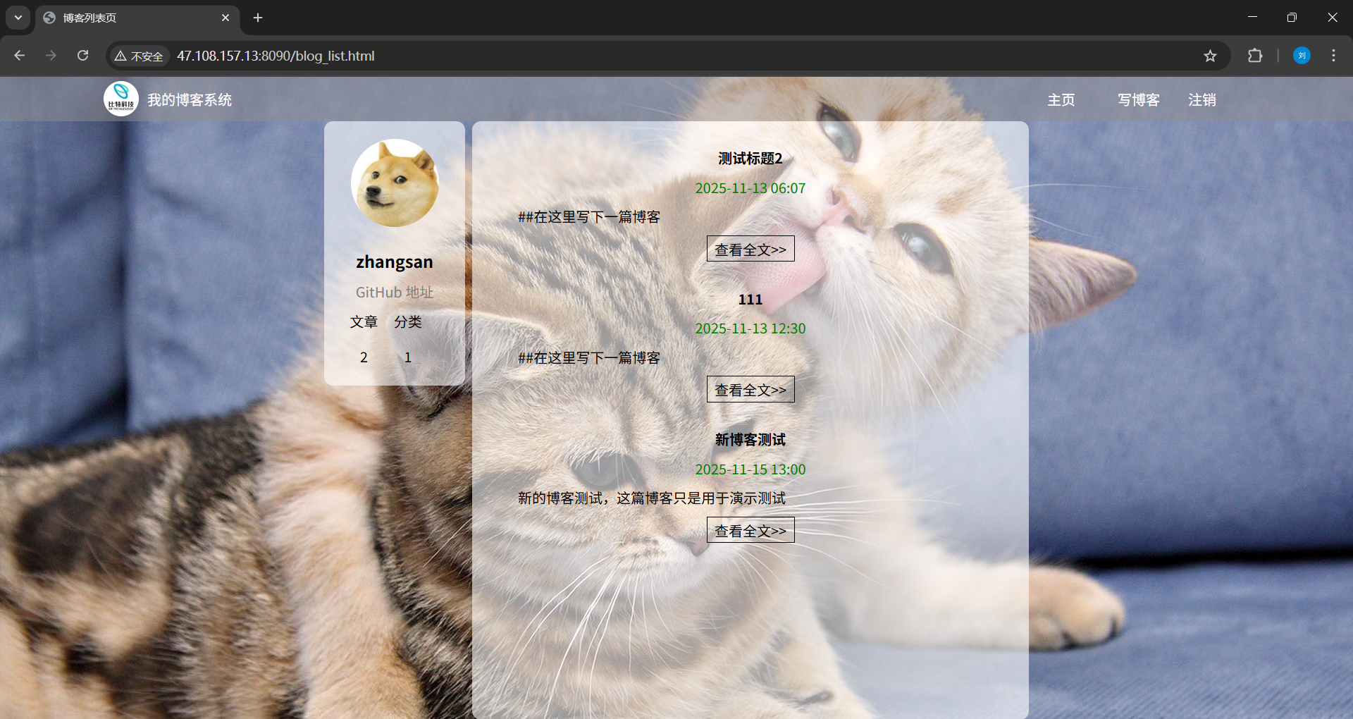 列表页面:可以在列表页查看有限数量的博客简介,其包括博客标题、发布时间以及内容概要。在左侧可以看到登录的用户以及文章数、分类数等的模块。在右上角有主页、写博客和注销三个功能:主页即列表页,写博客即博客编辑页,注销即注销用户,回到登录页面。