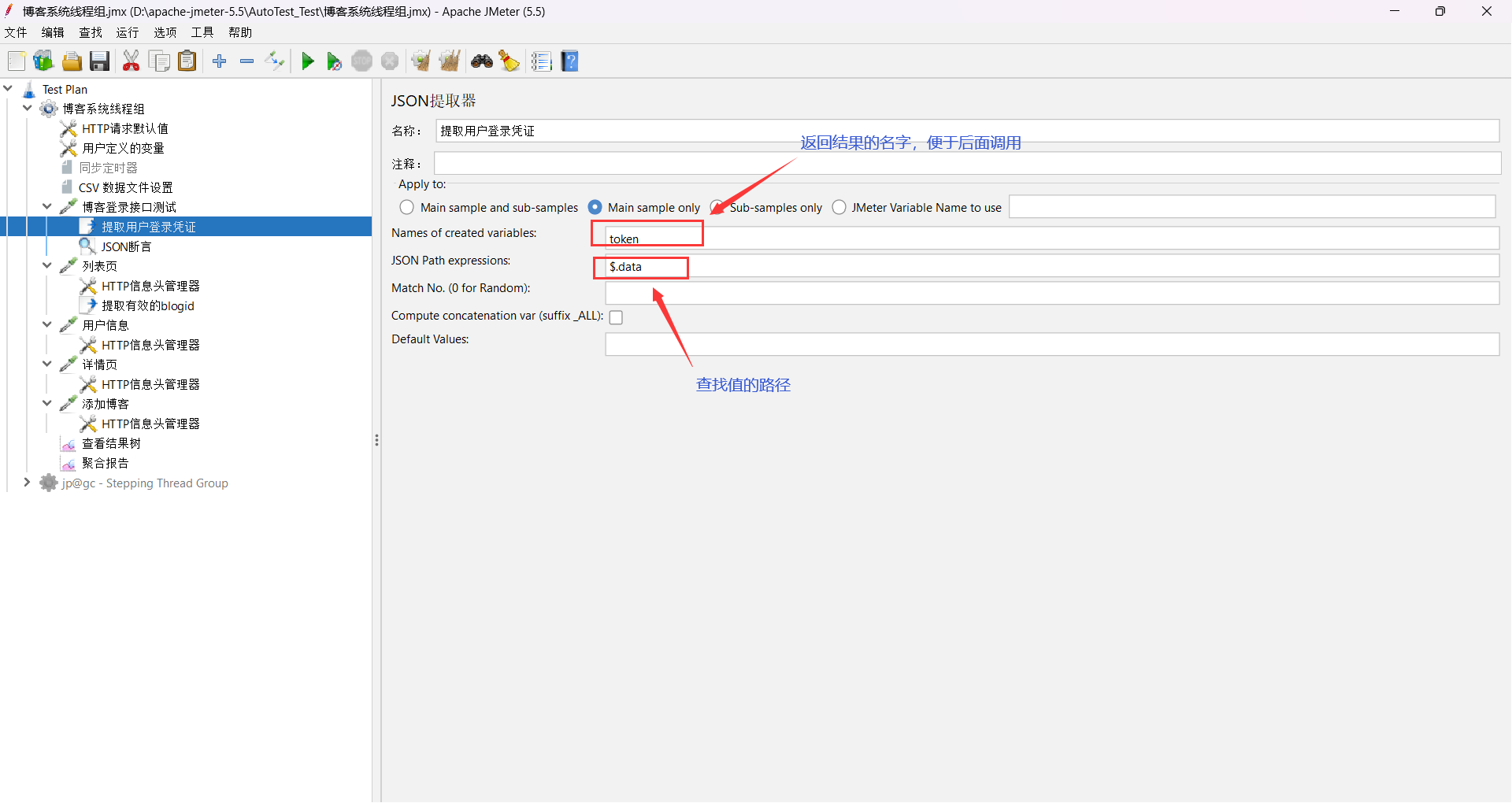 这里使用json提取器要注意的是:json提取器会重复提取data,得把json提取器放到登录页的子路径下,只让他提取登录页的data,此时我们就解决了user_token_header元素更新的问题。