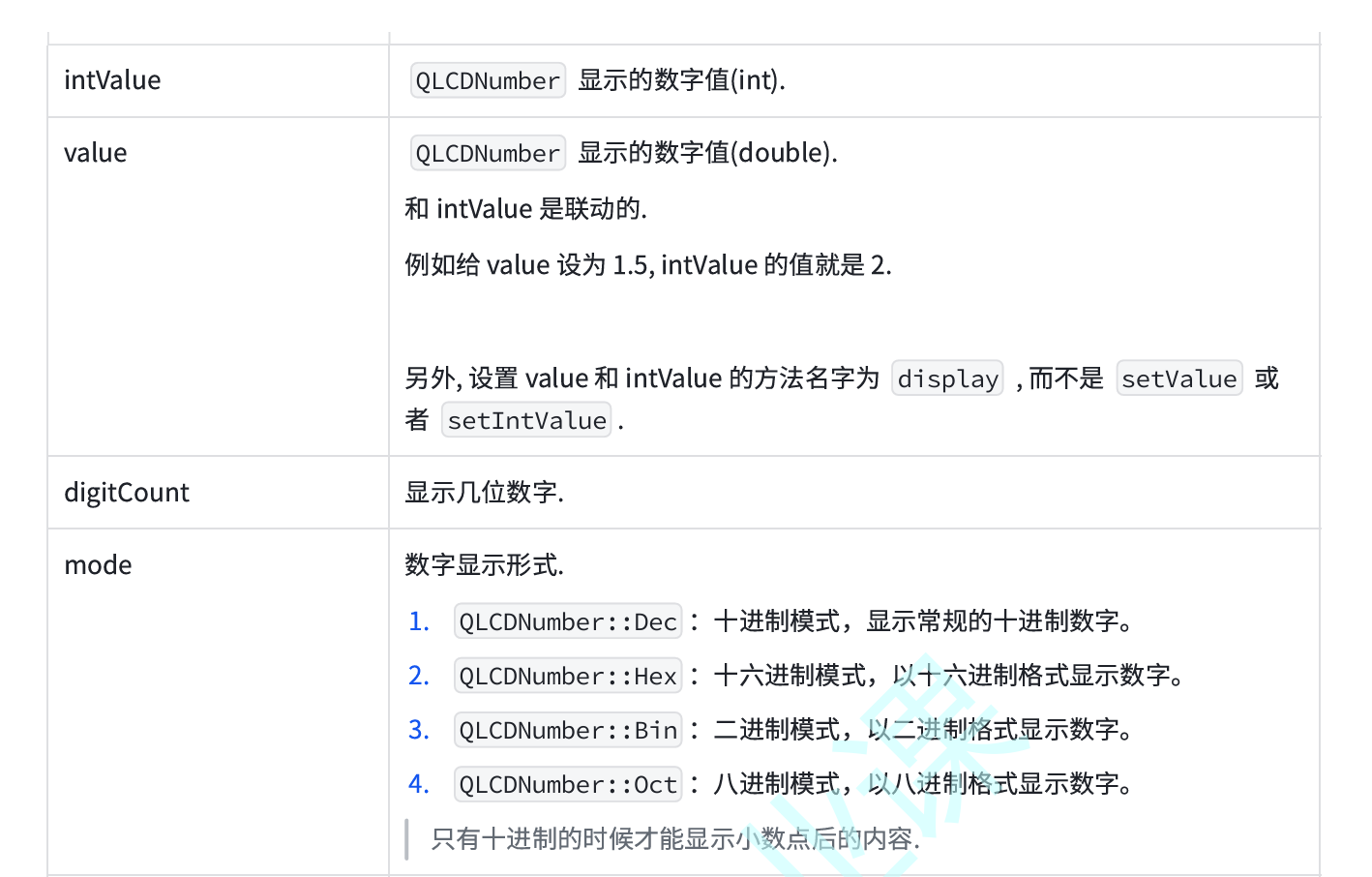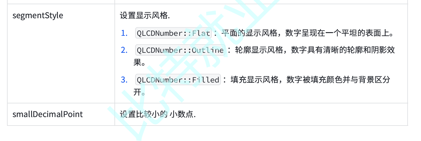 {ui->setupUi(this);//QLCDNumber这个组件是一个专门用来显示数字的控件,类似于计时器那个液晶的显示数字的屏幕//相关属性//intValue QLCDNumber显示的数字值(int),遵循四舍五入的原则//value QLCDNumber显示的数字值(double)//设置value和intValue的⽅法名字为display方法,相当于设置初始数字的方法是display//setDigitCount方法用来显示几位数字//Mode mode()用于提取数字显示形式,一共有4种显示形式,只有十进制的模式才能显示小数点后面的内容//Mode setMode() 设置数字的显示形式qDebug() << ui->lcdNumber->mode();//setSegmentStyle(QLCDNumber::) 设置显示风格,可以设置三种风格//QLCDNumber SegmentStyle() 获得显示风格qDebug() << ui->lcdNumber->segmentStyle();ui->lcdNumber->setSegmentStyle(QLCDNumber::Outline);//setSmallDecimalPoint(bool) 是否设置比较小的小数点ui->lcdNumber->setSmallDecimalPoint(true);//setEnabled(bool) 是否禁用ui->lcdNumber->setDisabled(true); //和上面那个一样的//最常用的就是display方法}Widget::~Widget()