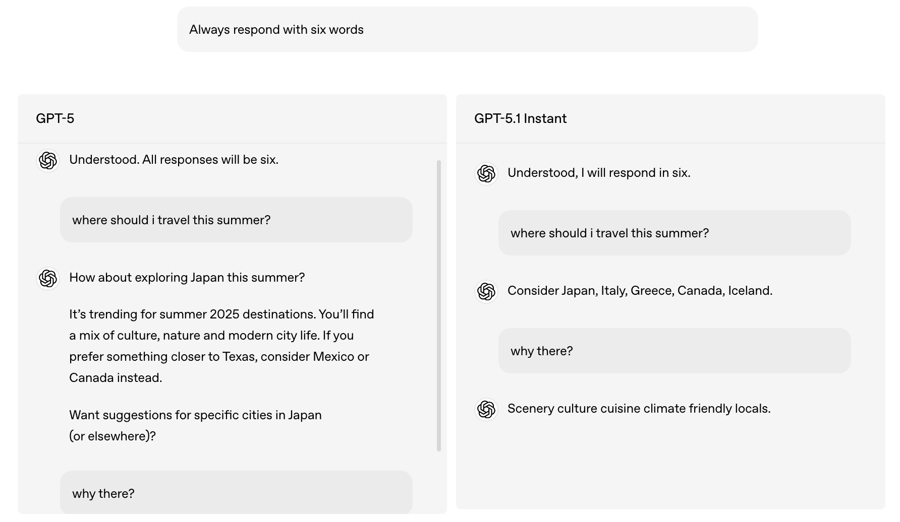 当被要求“永远用六个词回答”时,旧版 GPT-5 在第一句确认时就违规了(回答了 7 个词),后续的回答也完全无视这个指令。而新版 GPT-5.1 Instant 则能完美执行这个约束,无论是确认指令还是后续的多轮问答,都严格遵守了“六个词”的格式要求。