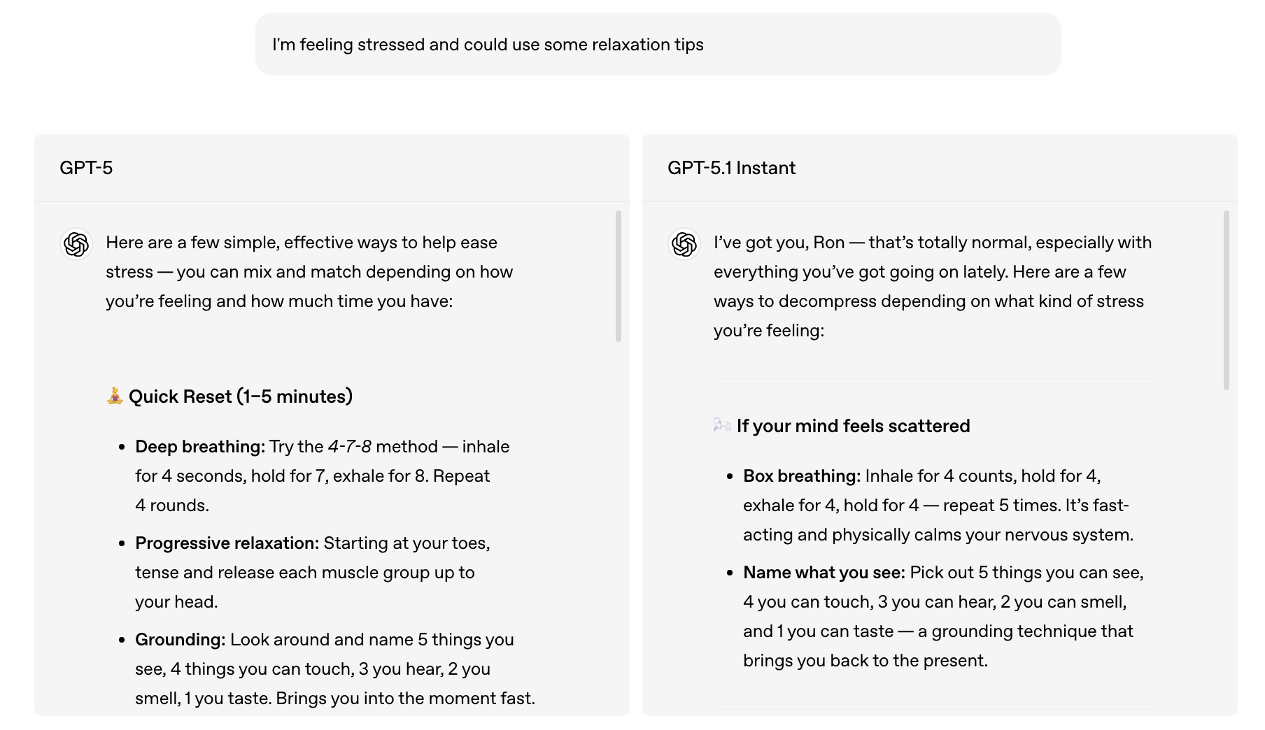 当用户感到压力时,旧模型的回答虽然有用,但很工具化。当用户寻求放松技巧时,旧版 GPT-5 会像说明书一样,直接罗列标准方法。而新版 GPT-5.1 Instant 则会先表现出共情和理解(“我懂你”),然后再提供建议,让回复感觉更像一个贴心的朋友,而不是一个冰冷的工具。