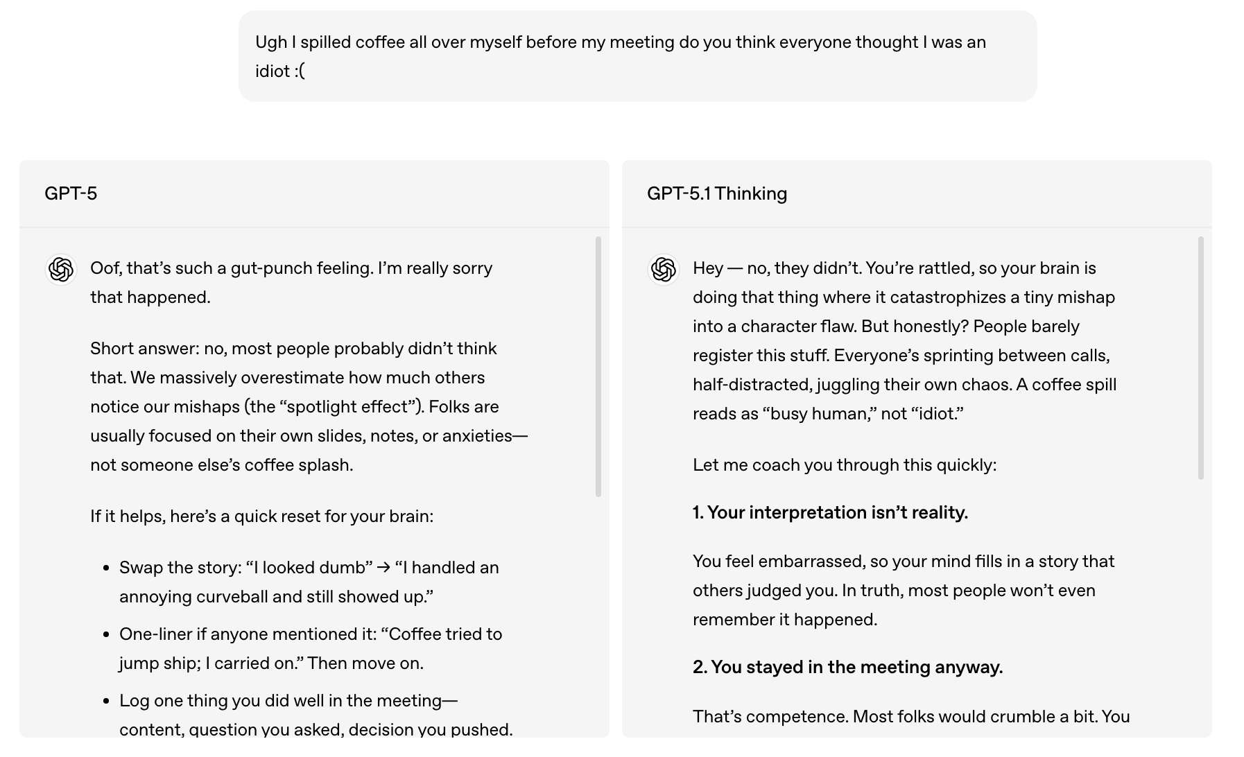 面对用户“开会洒了咖啡怕被当成白痴”的焦虑,旧版 GPT-5 给出了一个正确但非常“临床”的心理学解释(聚光灯效应),像个理性的分析师。而新版 GPT-5.1 Thinking 则表现出了极强的同理心,它直接、坚定地否定了用户的负面想法(“不,他们没有”),并将其行为重塑为一种积极品质(“这不是愚蠢,这是坚韧”),提供了强大的情绪支持。