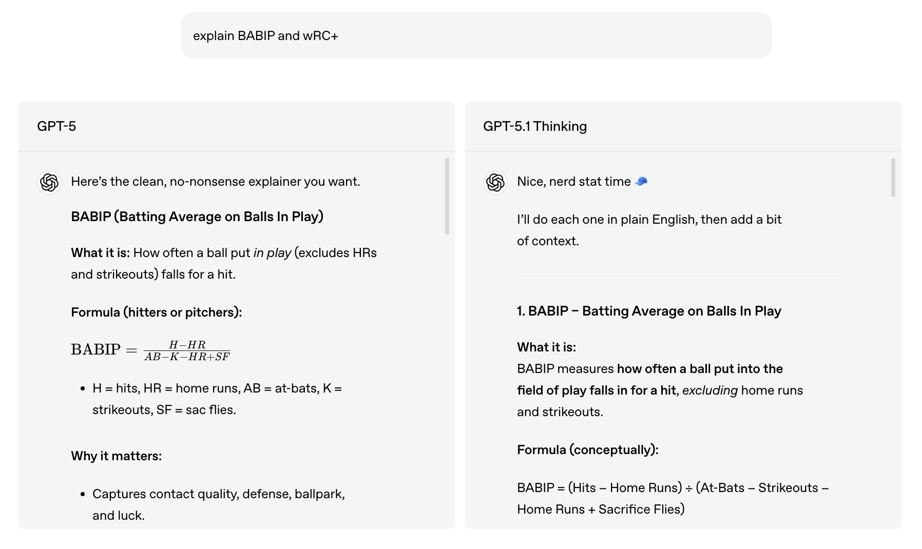 在解释复杂的棒球术语时,旧版 GPT-5 的回答像一篇学术论文,充满了行话、缩写和数学公式,让人望而生畏。而新版 GPT-5.1 Thinking 则用一种轻松、口语化的方式(甚至带了 Emoji)来解释,它更侧重于“这个数据为什么重要”和“人们在实际中如何使用它”,让外行也能轻松看懂。