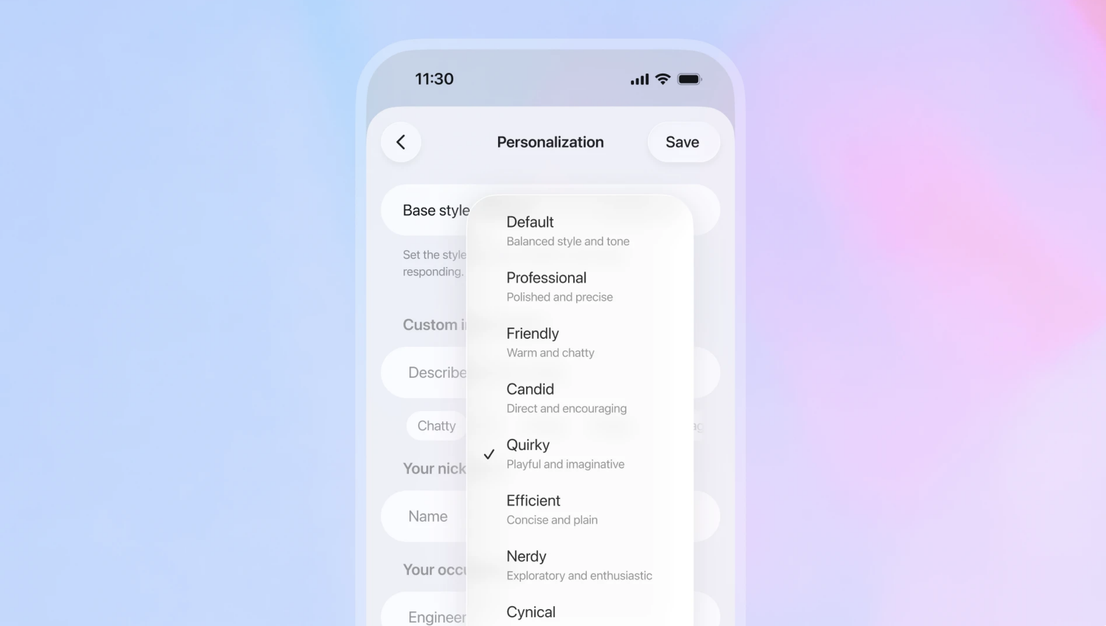 Default (默认)Friendly (友好型)Efficient (高效型)Professional (专业型) Candid (坦率型) Quirky (古怪型) Cynical (愤世嫉俗型)Nerdy (书呆子型)