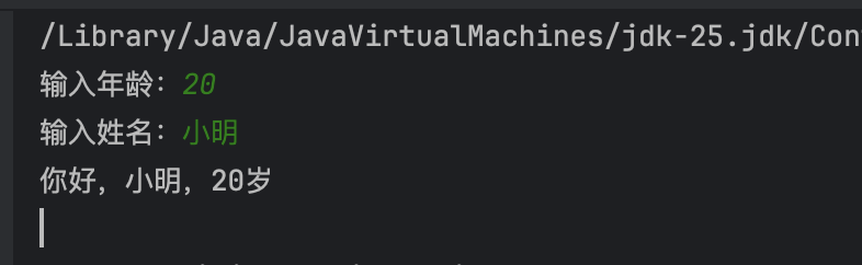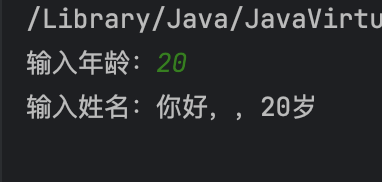 static void main(String[] args) {Scanner scanner = new Scanner(System.in);System.out.print("输入年龄:");int age = scanner.nextInt();System.out.print("输入姓名:");String name = scanner.nextLine();System.out.println("你好," + name + "," + age + "岁");}