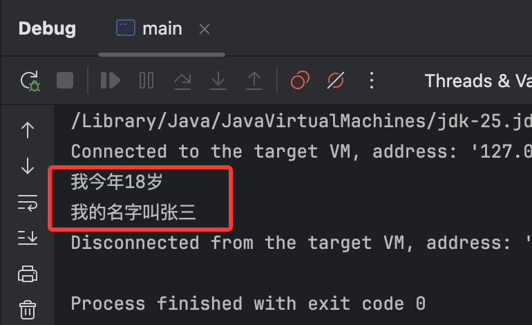 static void main(String[] args) {int age = 18;String name = "张三";System.out.println("我今年" + age + "岁");System.out.println("我的名字叫" + "张三");}
