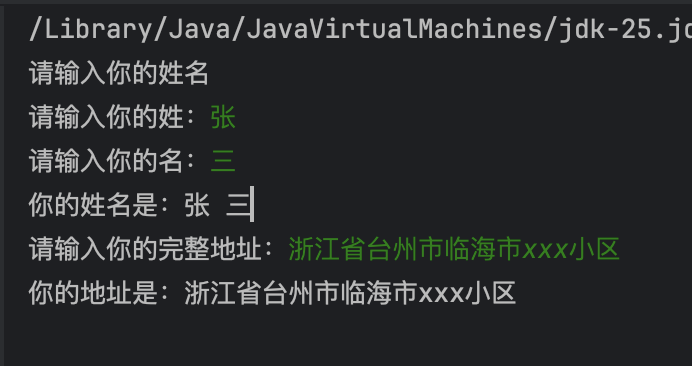 public static void main(String[] args) {Scanner scanner = new Scanner(System.in);System.out.println("请输入你的姓名");System.out.print("请输入你的姓:");String firstName = scanner.next(); // 读取到空格为止System.out.print("请输入你的名:");String lastName = scanner.next();System.out.println("你的姓名是:" + firstName + " " + lastName);// 清除缓冲区scanner.nextLine();System.out.print("请输入你的完整地址:");String address = scanner.nextLine(); // 读取整行System.out.println("你的地址是:" + address);scanner.close();}